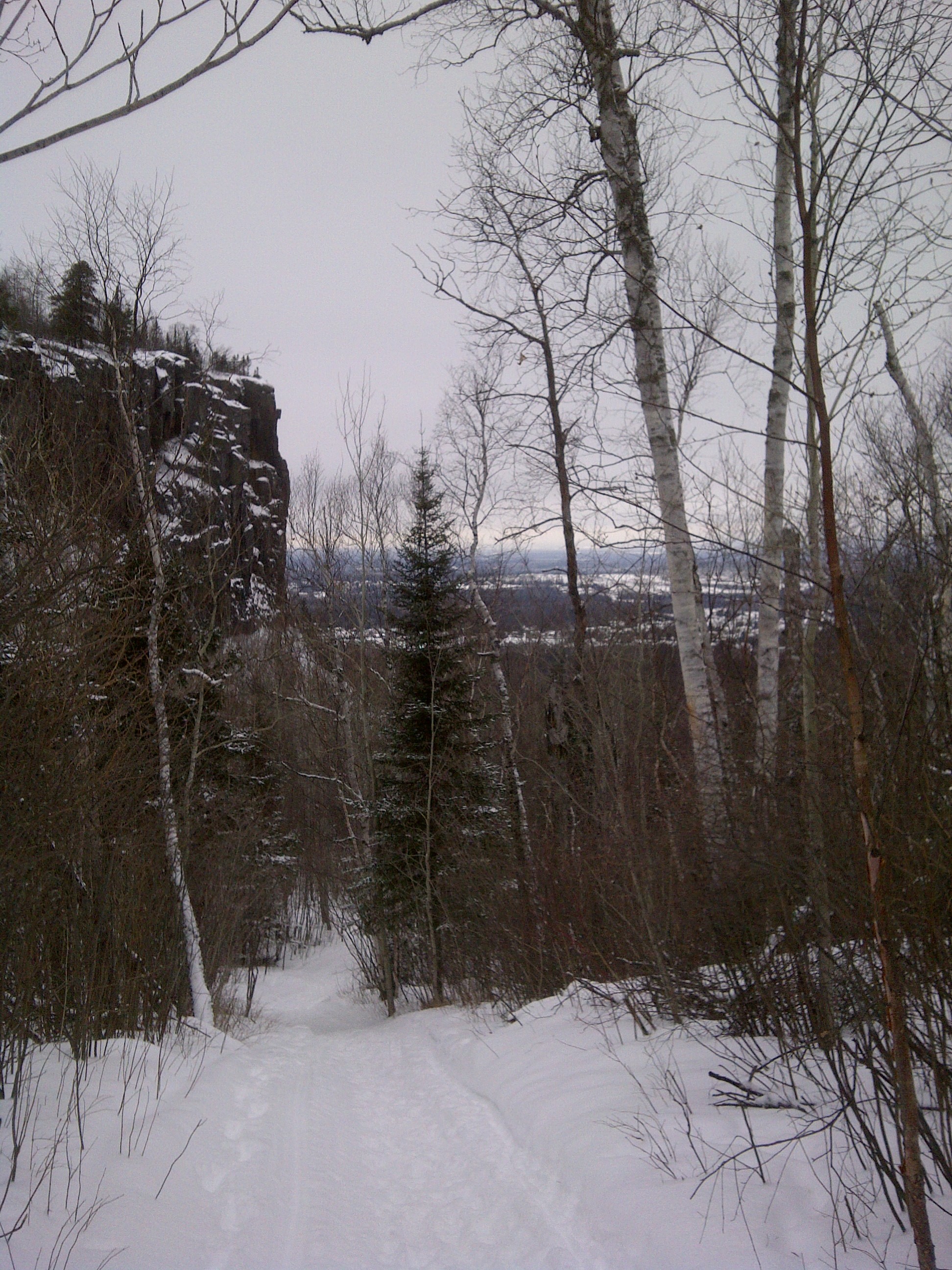 Sunday afternoon found me and boys back on the trail up the mountain, determined to surpass last week’s distance. So we headed up another level on the mountain, which unfortunately has some tough sections. One area, which is too rough and narrow for snowmobiles (most of the trails are used by both hikers and snowmobilers), includes a 250 foot vertical rise in 1100 feet. That’s a thigh-crushing, hamstring-tightening, lung-popping 23% grade…how’s that for a description! Trying to get two little boys up that is not easy, nor is the fact that I could stand to lose 10 pounds and am somewhat out of shape. However, the view makes it all worth it, as does the time I get to spend with my sons. I really hope they grow up to appreciate and enjoy the outdoors as much as I do. I’m already mentally planning where I’d like to take them on my personal day in June…Leeblain comes to mind 🙂