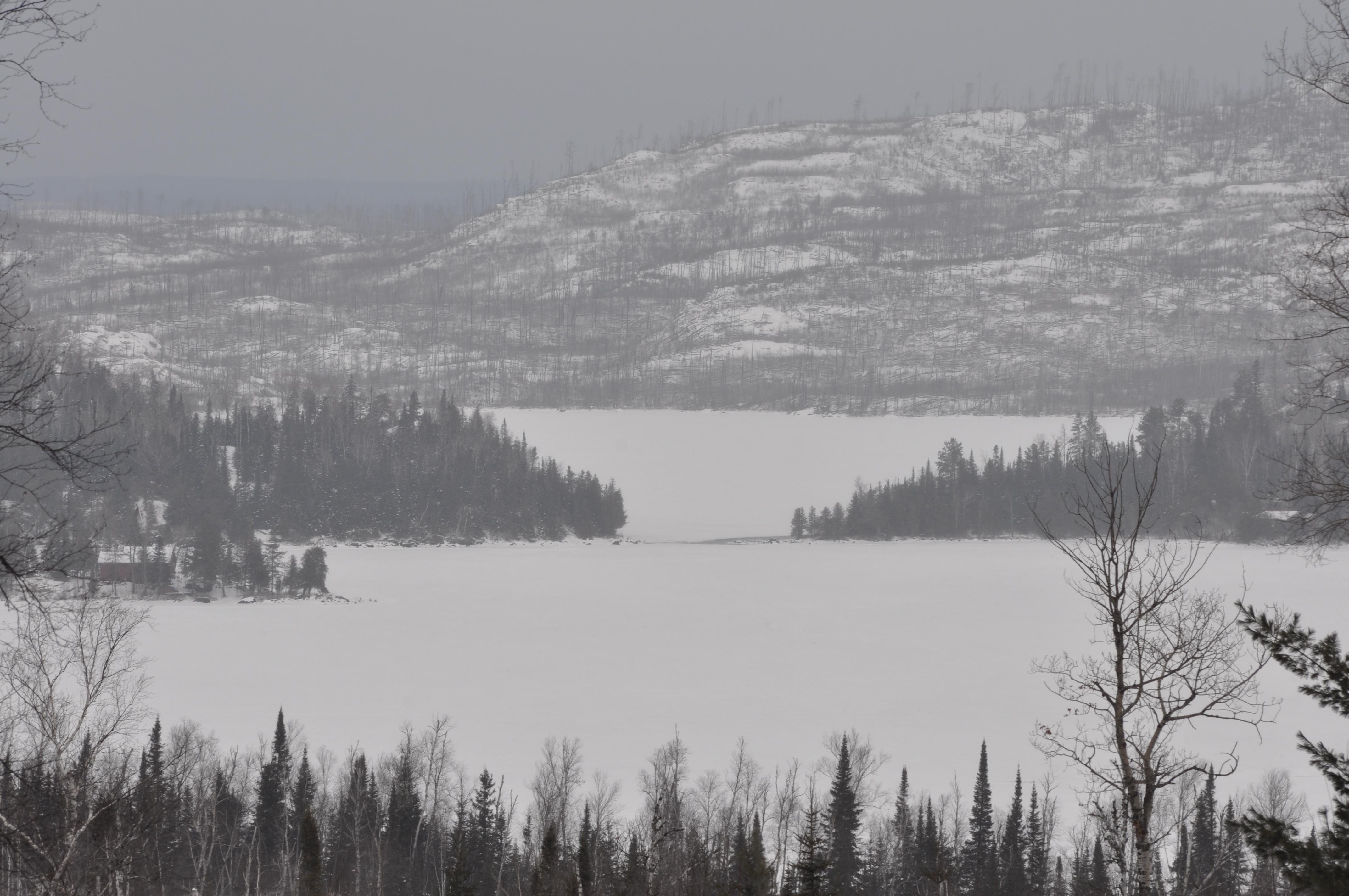 I decided to leave from home early on Saturday morning as there was a chance of snow and I wanted to take my time in case the roads were bad. It’s about a 2 hour, 45 minute drive to Gunflint on a good day, so I figured I’d have plenty of time to get there. I had time to burn lest I arrive too early, so I stopped in Grand Marais to snap some photos of the harbour. Pulling in to Gunflint I stopped for the first time at the lake overlook just off of the trail and got some good shots of the narrows between Ontario and Minnesota.