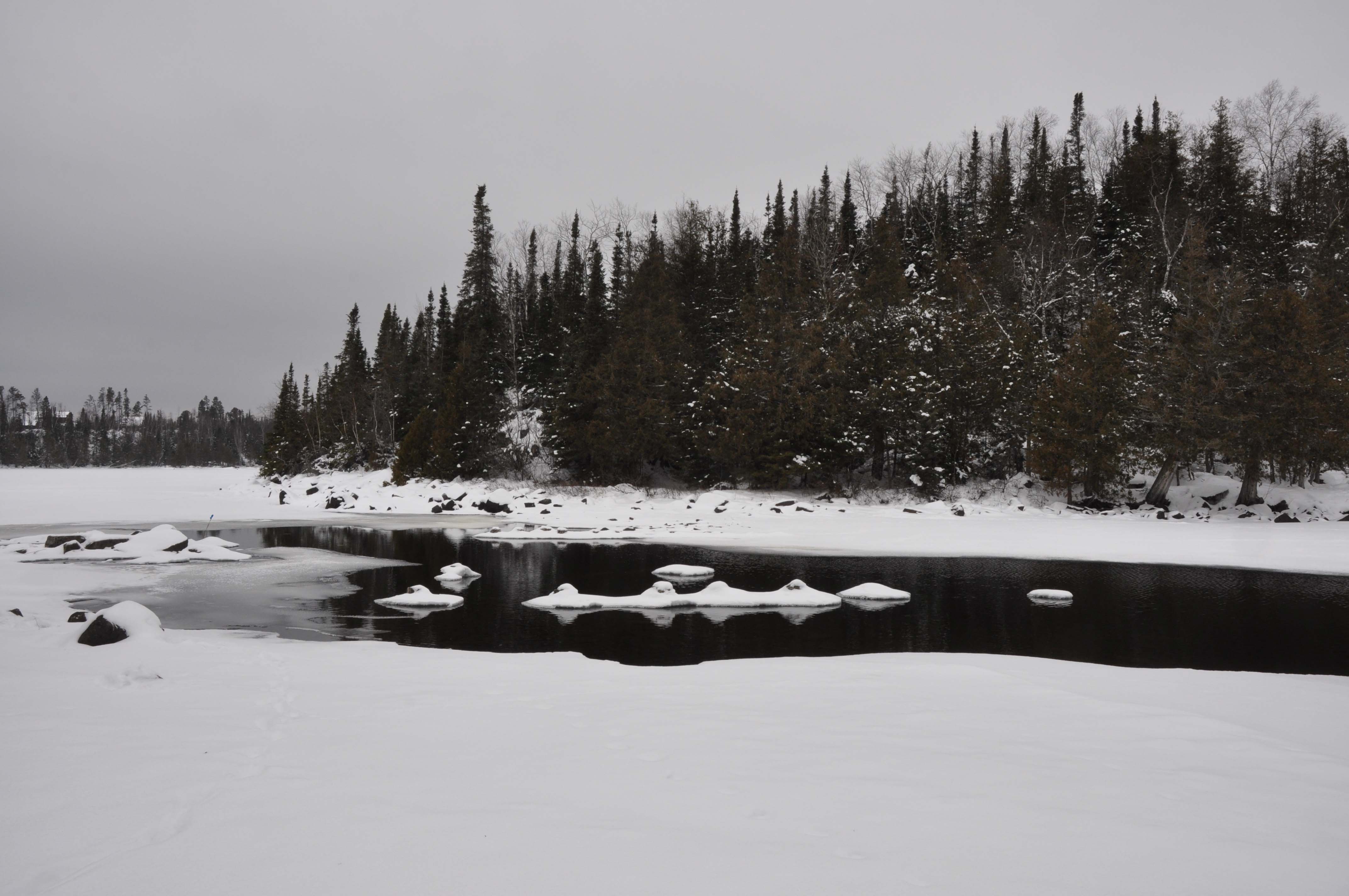 Three hundred metres farther west I arrived at the narrows, unfortunately disappointed that the current between Gunflint and Magnetic Lake had prevented ice from forming; I would have to settle for snapping some pictures from the Canadian side only. However, the side effect of a dry fall and the cold winter was the lake level was the lowest I’d ever experienced. I was able to walk out very far into the channel and take some really neat pictures and video. Many of the bridge pilings, which are normally under water, were clearly exposed by at least 6 or more inches. Very interesting to see!
