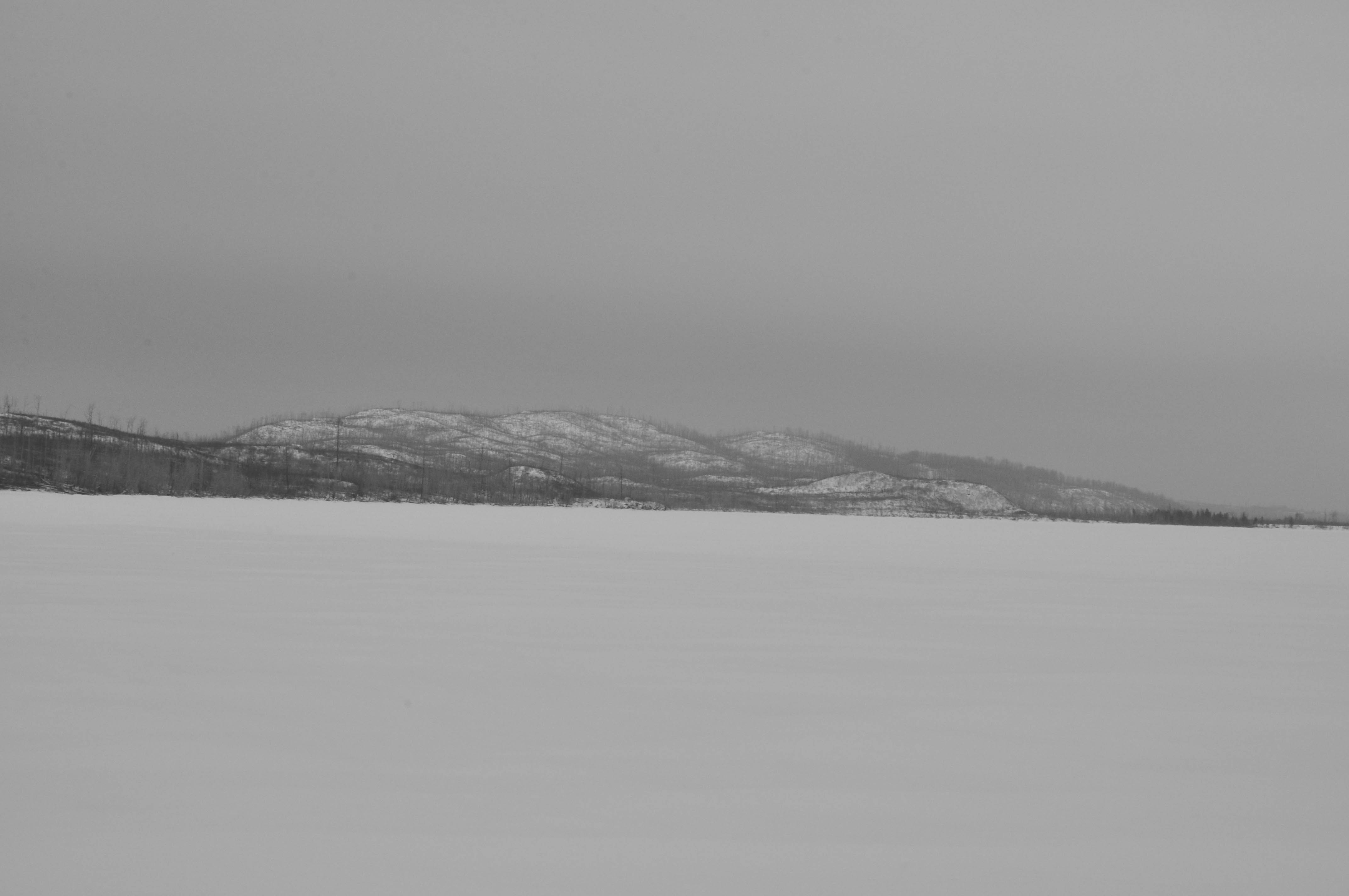 So I began my little journey in good spirits, happily trudging along the snow covered ice between the fishing shacks and snowmobilers. The going was a bit tough, as there were a few inches of snow on top of the ice that made each step a challenge. My GPS told me that the Canadian shore was a scant 1500 metres away…child’s play! That’s the distance I cover when I walk the dog and I’m not worse for wear. As I tromped along I became acutely aware of how much colder it was on the open expanse of the lake, and how my legs were becoming tired punching into the snow. However everything was tempered by the beauty of my surroundings; the high, rocky hills were more defined in the snowy landscape.