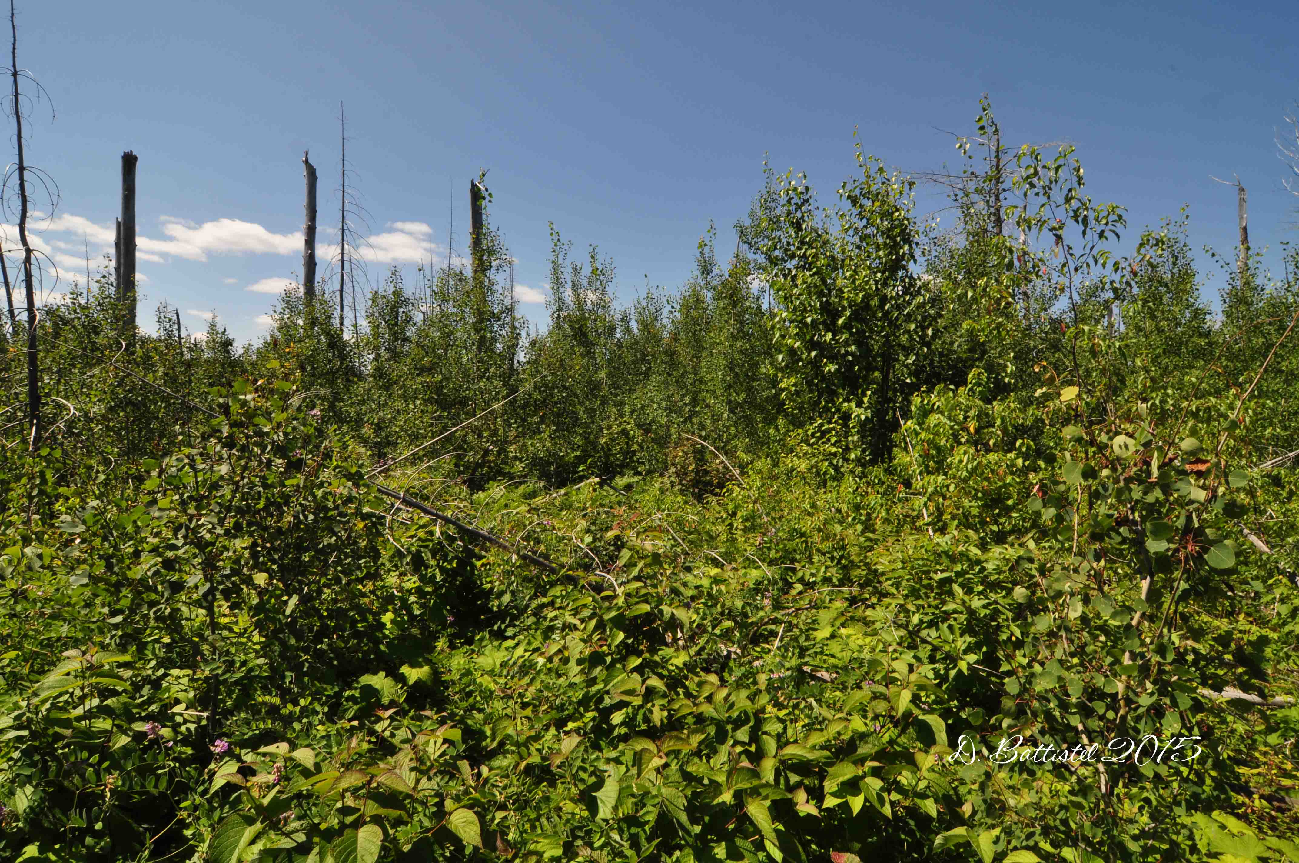 What was once a beautiful trail was now a warzone of deadfall, burned trees and new forest growth. The 1999 Boundary Waters-Canadian derecho and 2007 Ham Lake Fire had done a number on the area. In the tangle of brush, everything looked the same, while the sun blistered in the sky and there was no wind to cool things down. On the gps the grade was just metres to my right, but I could not seem to get there. As I became more frustrated, I became more agitated, which only added to my growing exhaustion as I slogged along. I fell numerous times, more than I ever had before (I’m usually good for at least one on each hike) and even broke a strap on my tactical vest used to carry my gear.