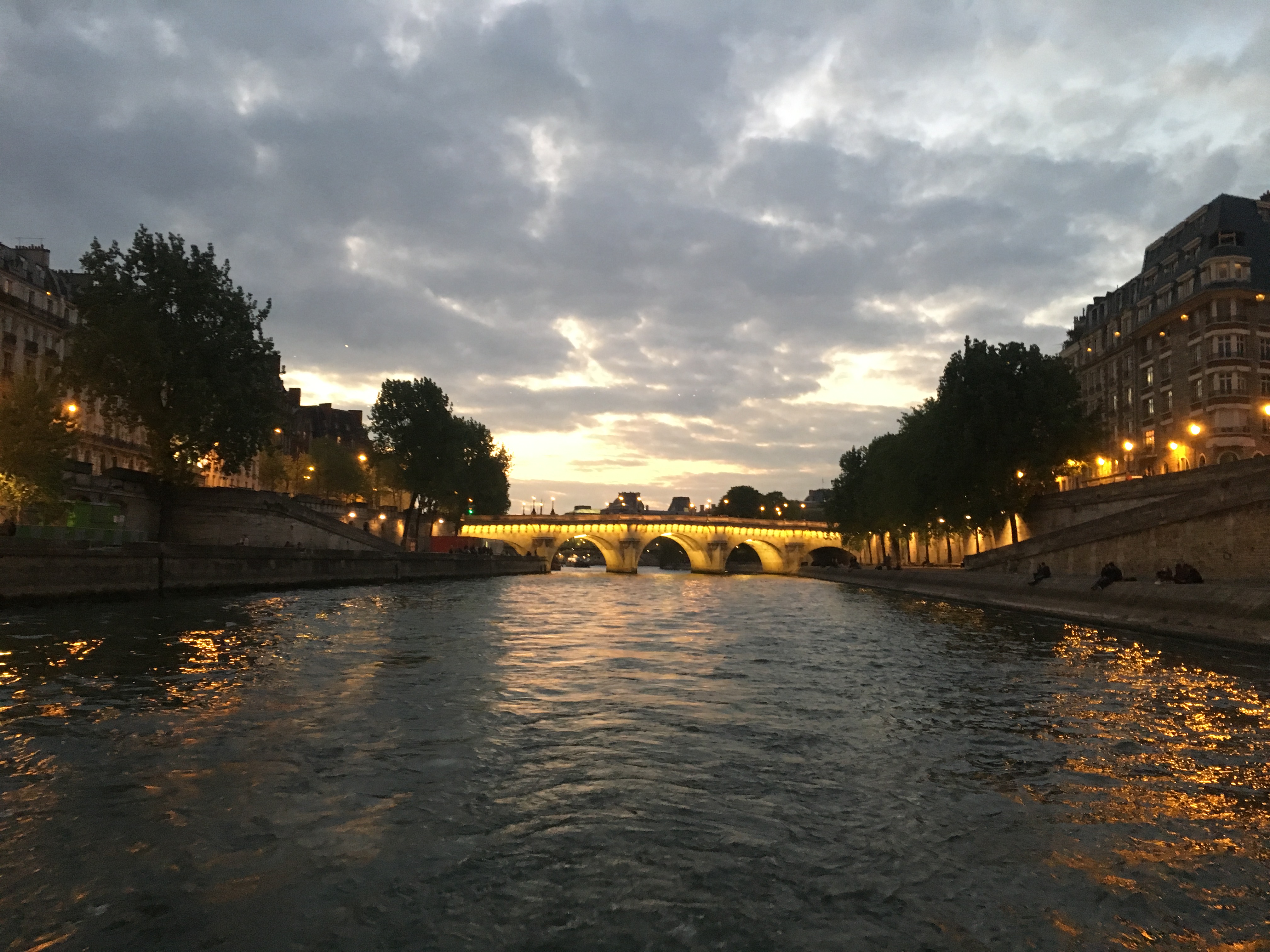 After eating, it was back on the Metro, with a transfer in between, to our next destination which was the Pont Neuf Bridge. There we would be taking a cruise along the Seine River at dusk to see the sites of Paris. It was 12€ well spent, as the kids really enjoyed this tour. Even though I had done it before, I found it interesting all over again. The only thing that didn’t go right was a few St. Ignatius girls getting drenched by a wave thrown up by a passing boat. They were able to laugh it off and so did we.