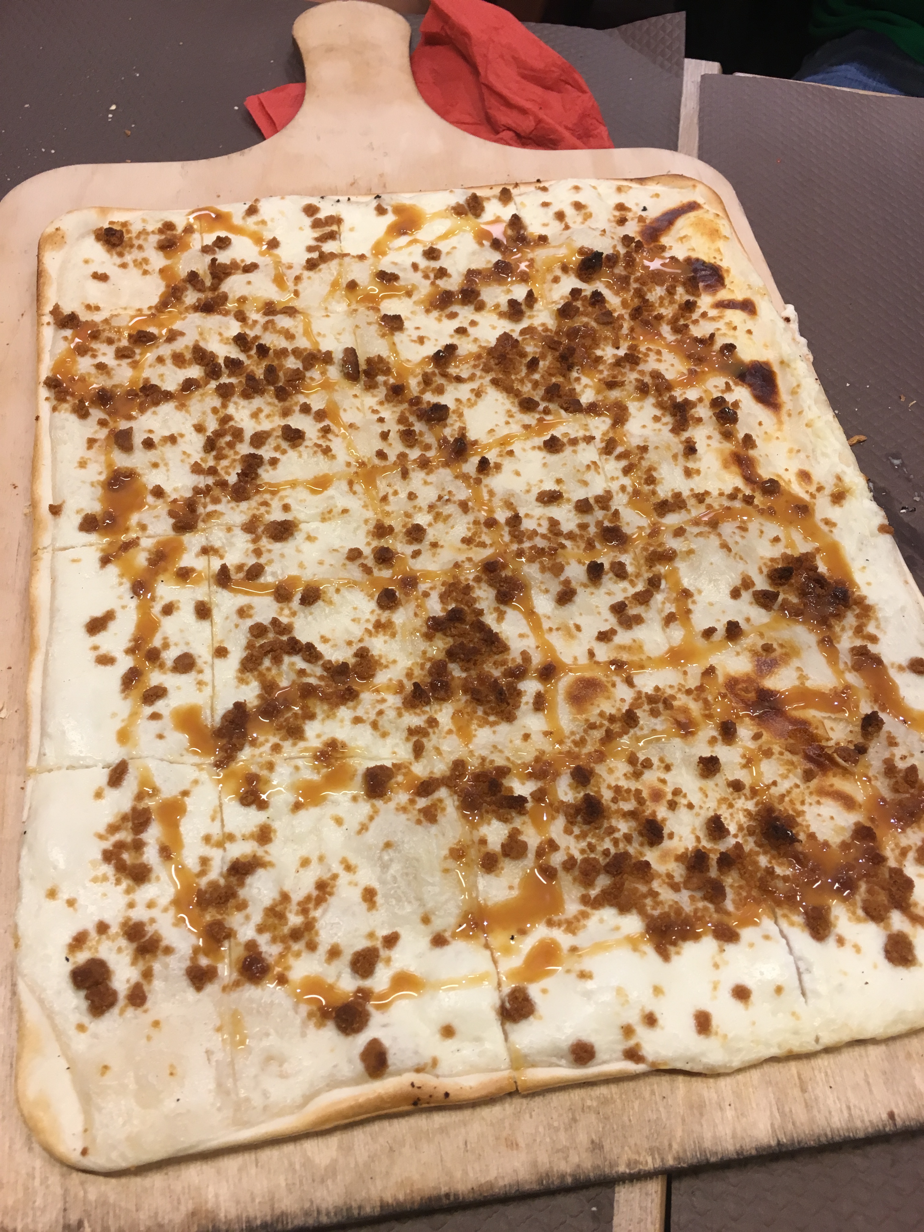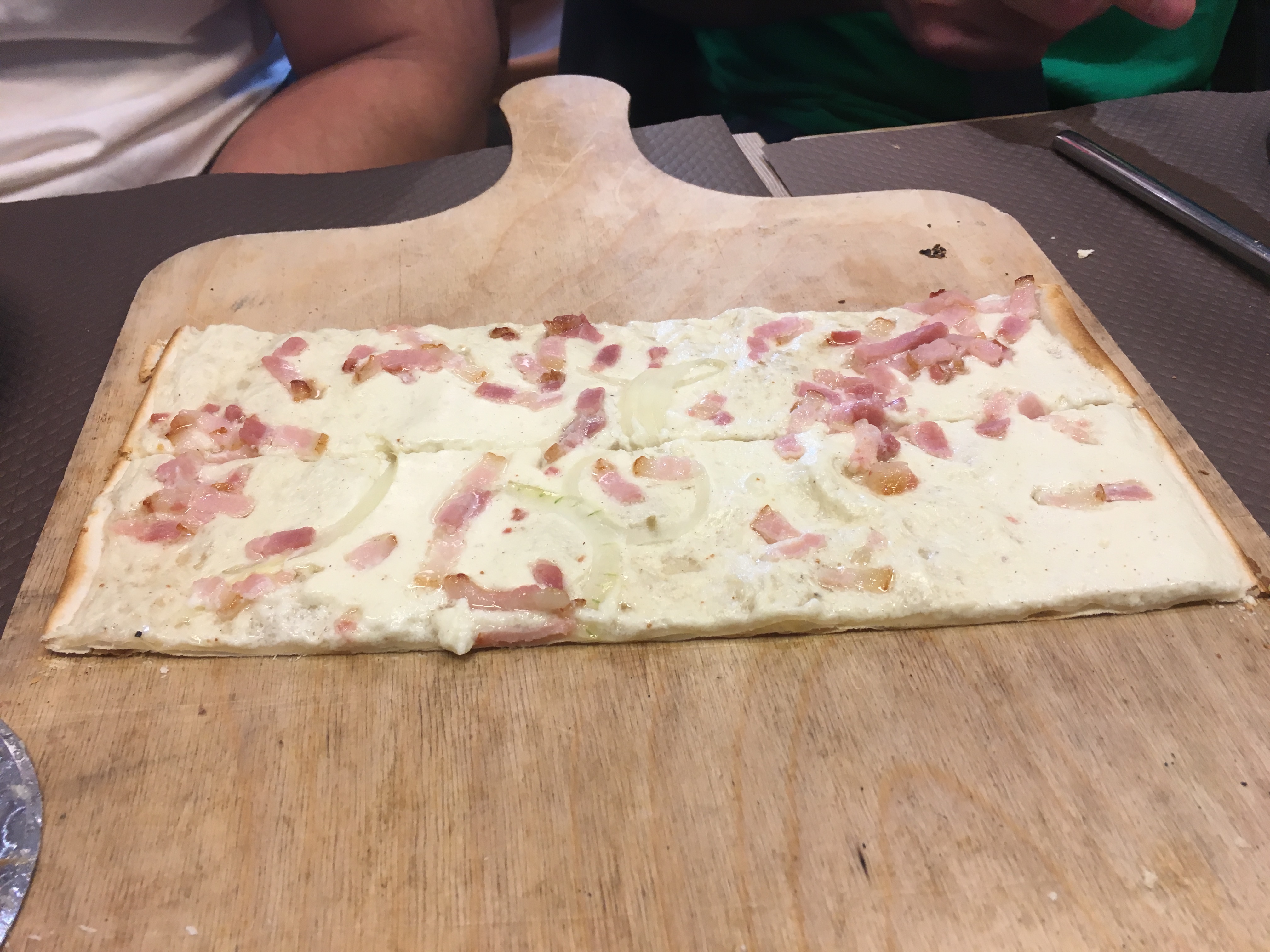 Lunch today was covered by EF and was at a place we had eaten on previous tours, Flamme’s. I didn’t realize it was a chain, and the location we ate at was not the one we’ve visited before. Flamme’s is short for Flammekueche, which is an Alascian style pizza. It has a very thin crust, and is topped with some form of white sauce and various meats and veggies (bacon, onions and mushrooms). It’s all you can eat, which I know the kids appreciated. It was finished off with caramel, chocolate and apple desert flammekueche, which was delicious.
