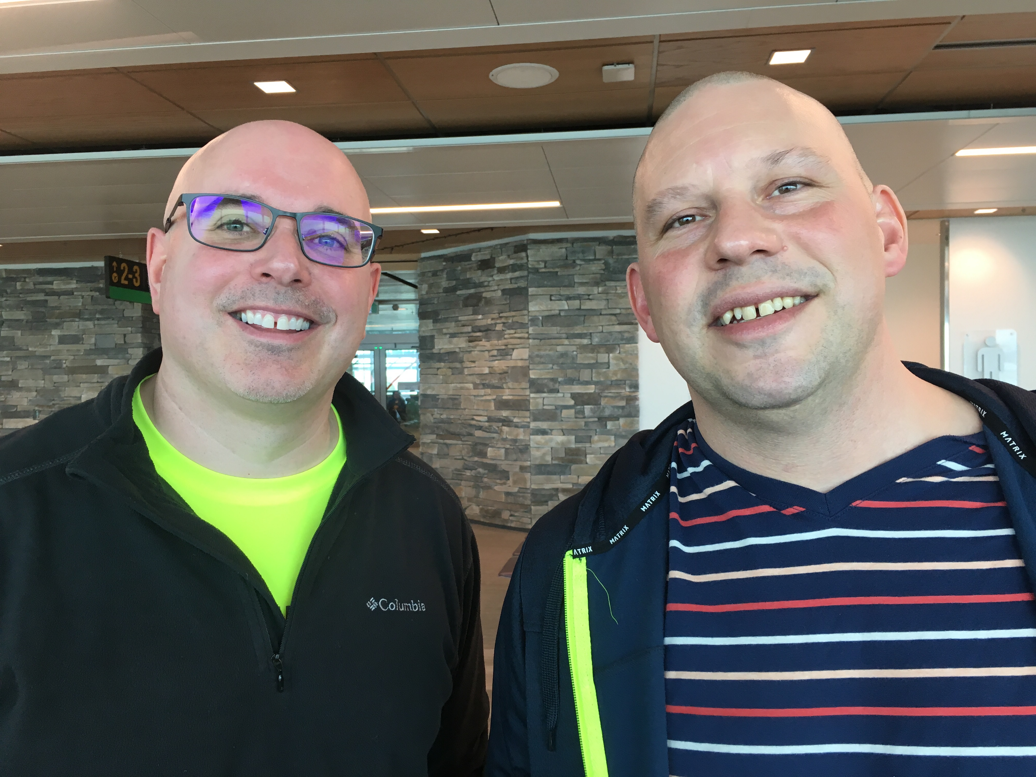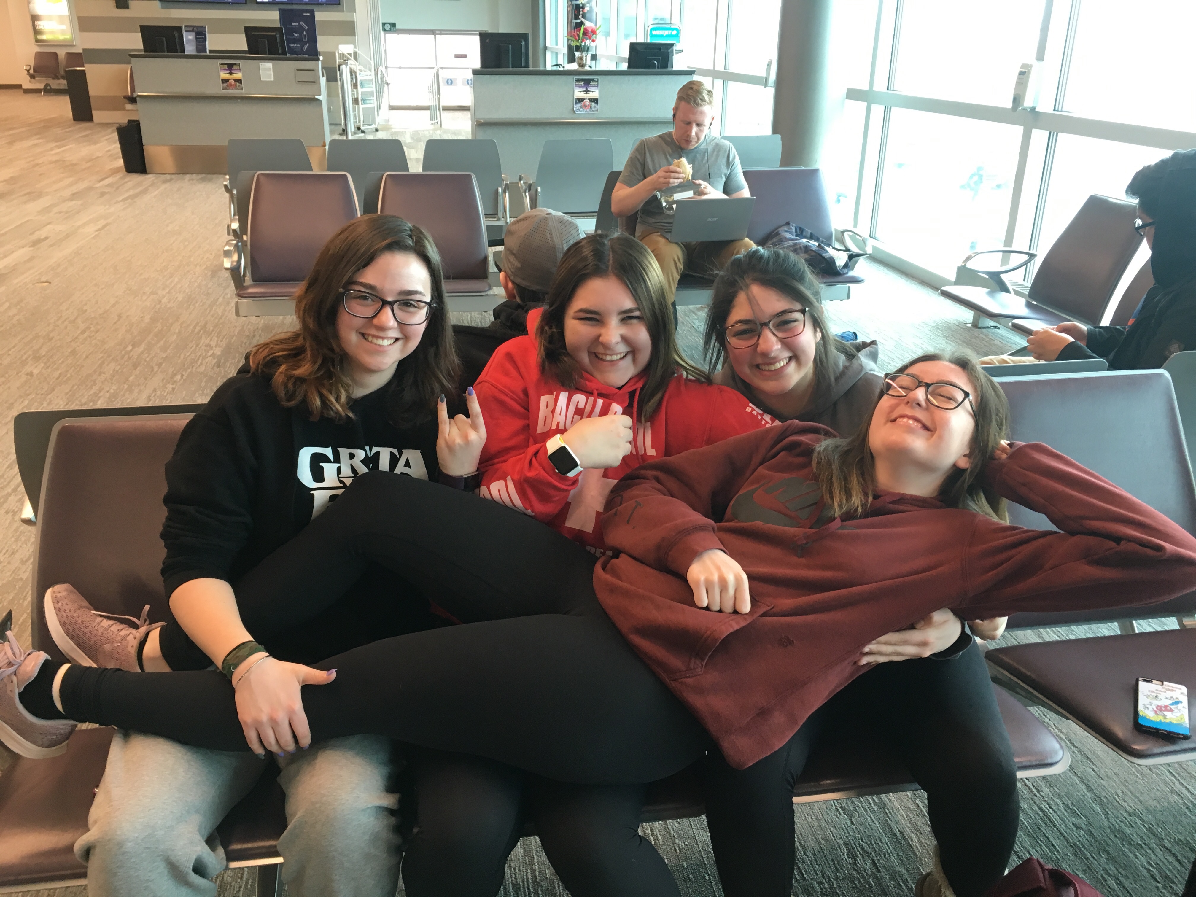 Waiting for our flight, March 2019.