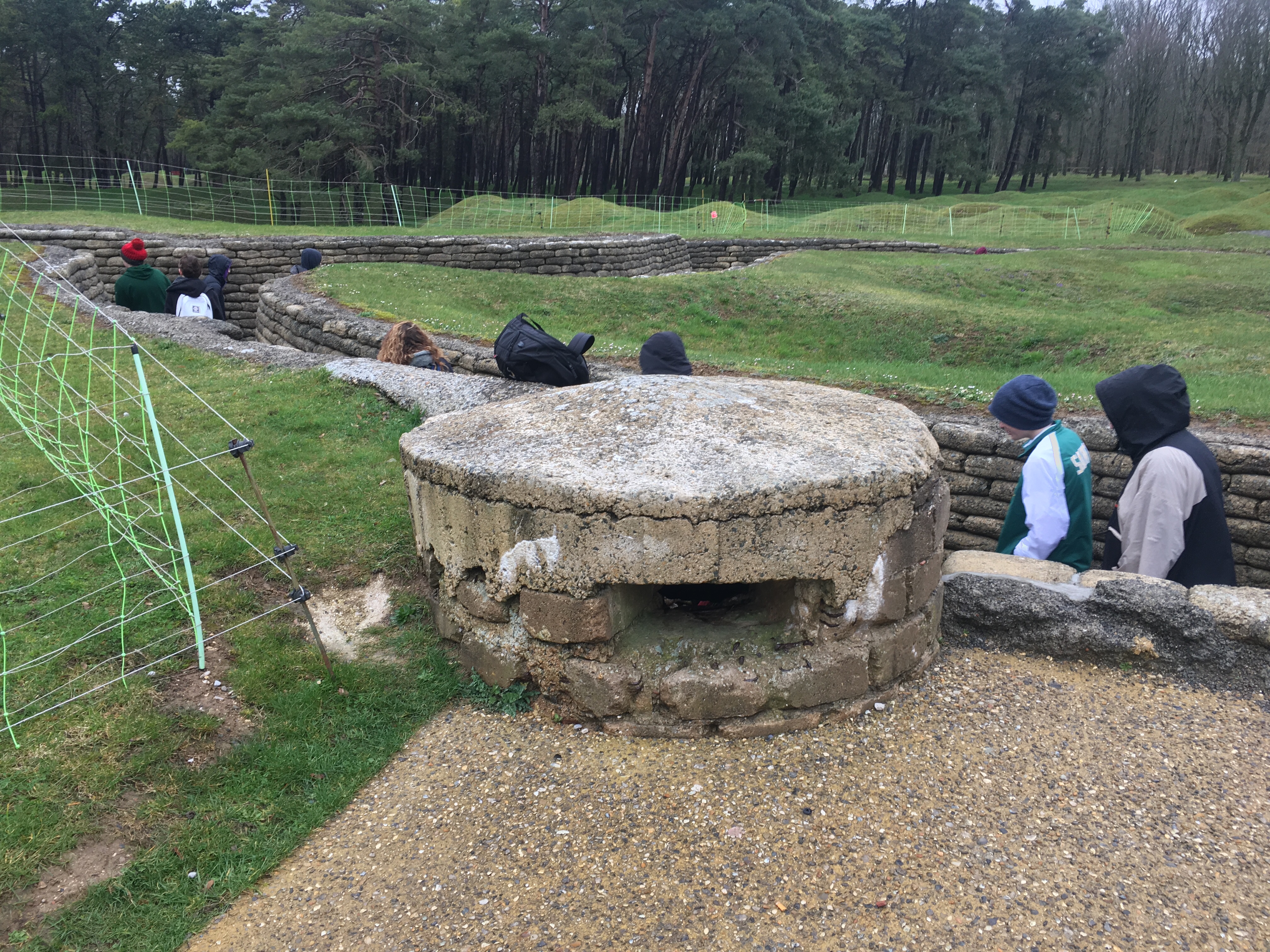 We had a great visit. The broke us up by school, with each group doing a separate tour. Our guide took us first into the subway system, tunnels dug by engineers through the soft chalk. They were used to move troops and equipment to the forward trenches away from observation and fire from the Germans on the ridge. This one was known as the “Grange Subway” and is an amazing piece of Canadian history. Unfortunately, and I’m not sure why, maybe because of flooding, our tour of the subway wasn’t as long as it was in 2014. Regardless, it was neat for the kids to see.