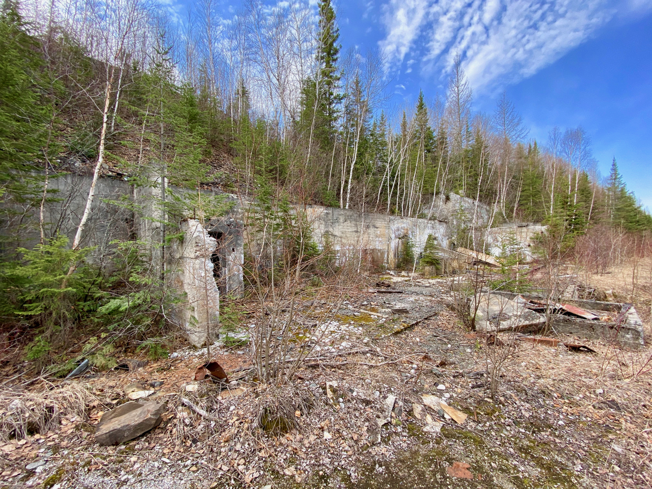 The second photo was taken in May 2021 looking west at the remains of the concrete foundations. The mine was located at Milepost 19.8 of the then Canadian National Railways Dorion Subdivision (MP 69.5 of the later CN Kinghorn Subdivision).