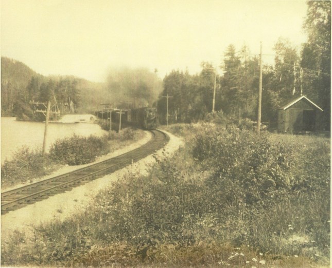 Unidentified locomotive leads a westbound near McCollum’s Reflection Lake Resort, circa 1950s. (CJ. Firebrand)
