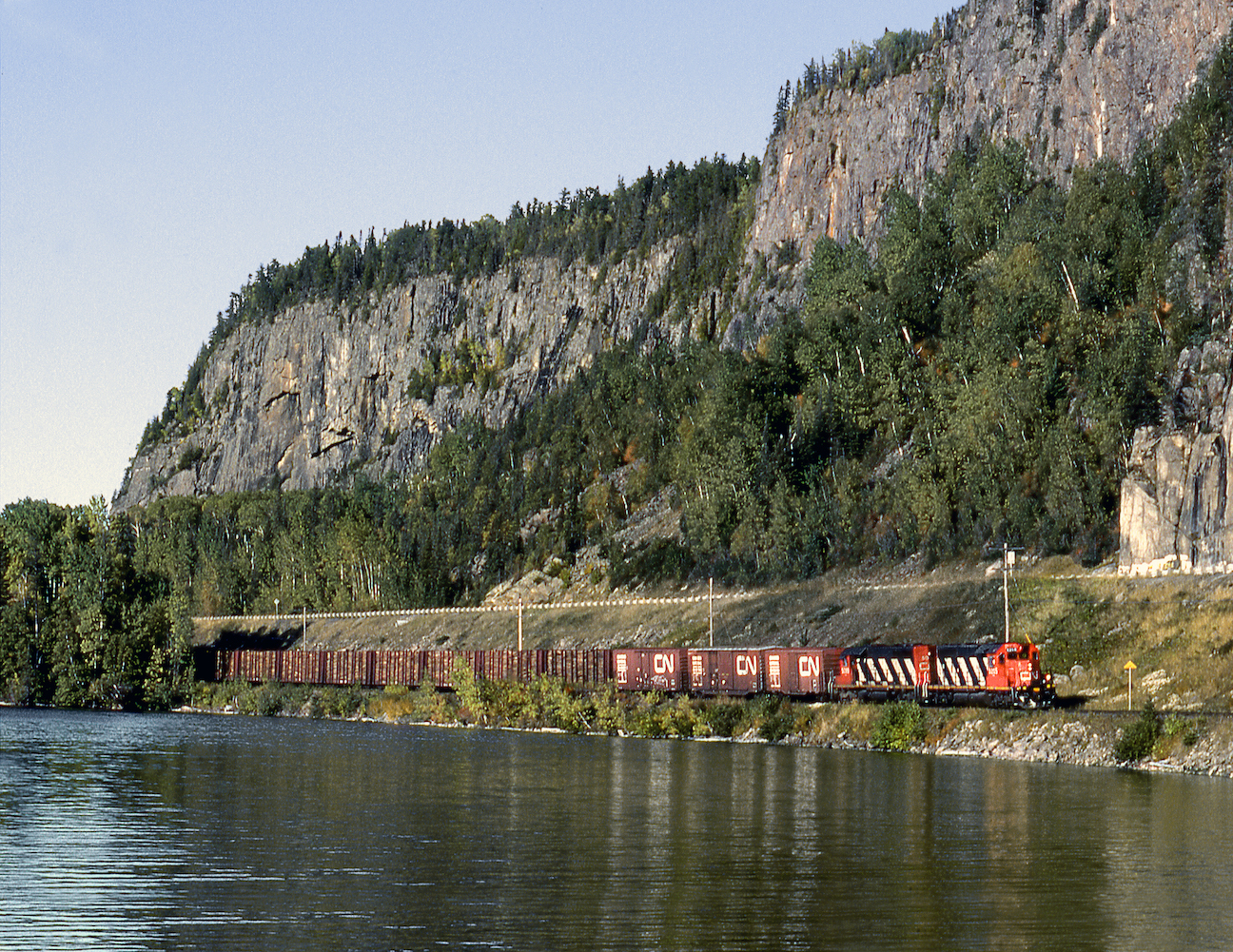 Westbound CN train 337, Hornepayne to Thunder Bay, along the bluffs overlooking Lake Nipigon’s Orient Bay