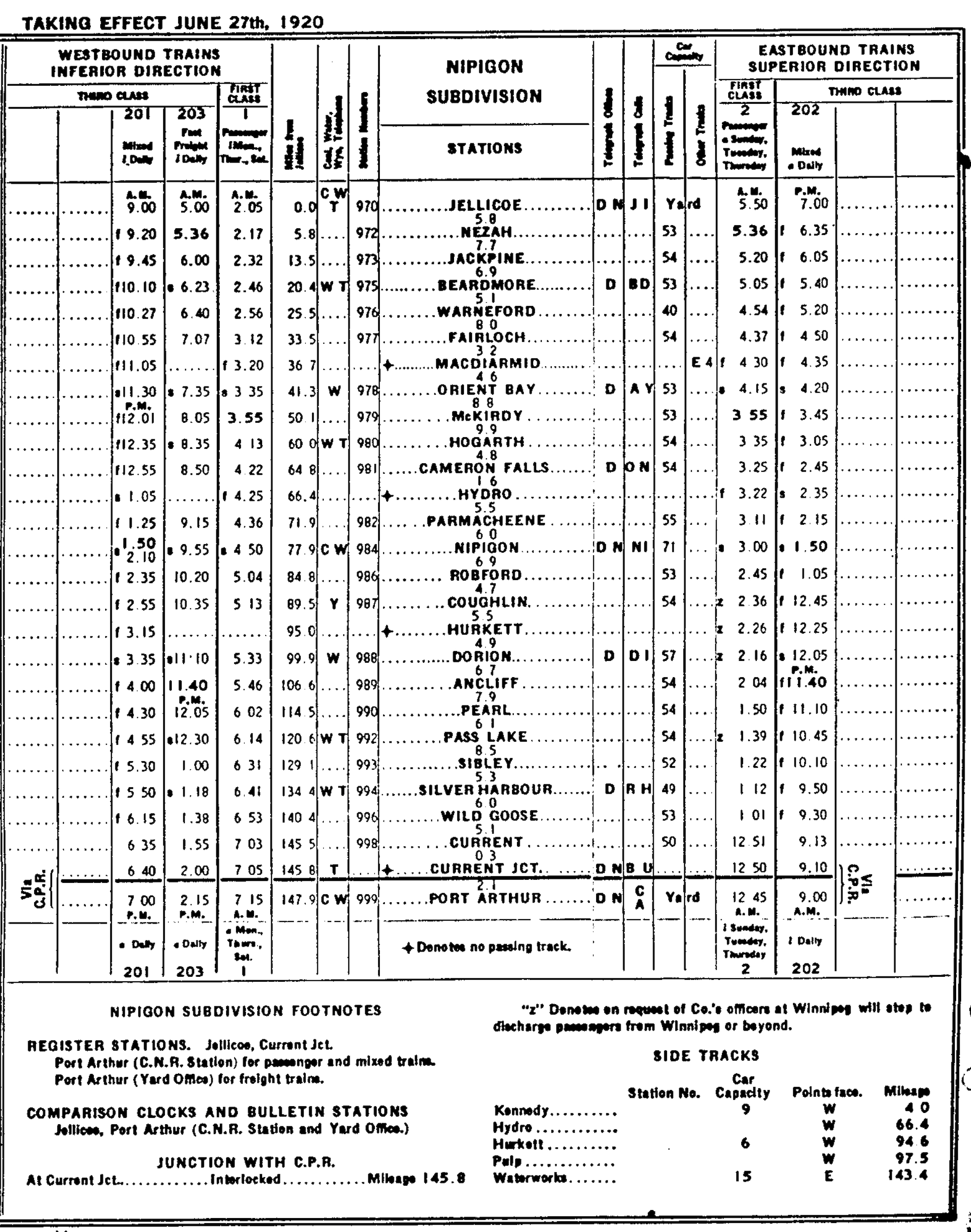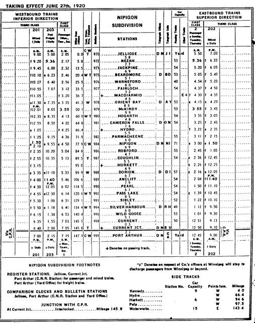CNR Nipigon Subdivision Timetable, 1920.