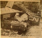 On October 28, 1970, a serious washout and derailment occurred 1.1 miles east of the station at the bridge over the Mackenzie River (MP 182.9). A sudden rush of water on the river washed out the grade on the east side of the bridge, causing 2 locomotives and 5 box cars of a westbound train to plunge into the depression. All three crewmen were injured.