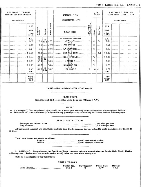 CNR Kinghorn Subdivision Timetable, 1934.