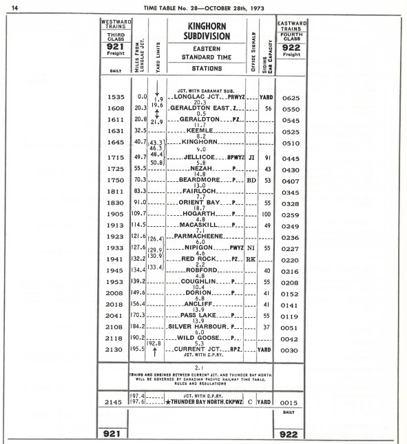 CN Kinghorn Subdivision Timetable, October 1973.