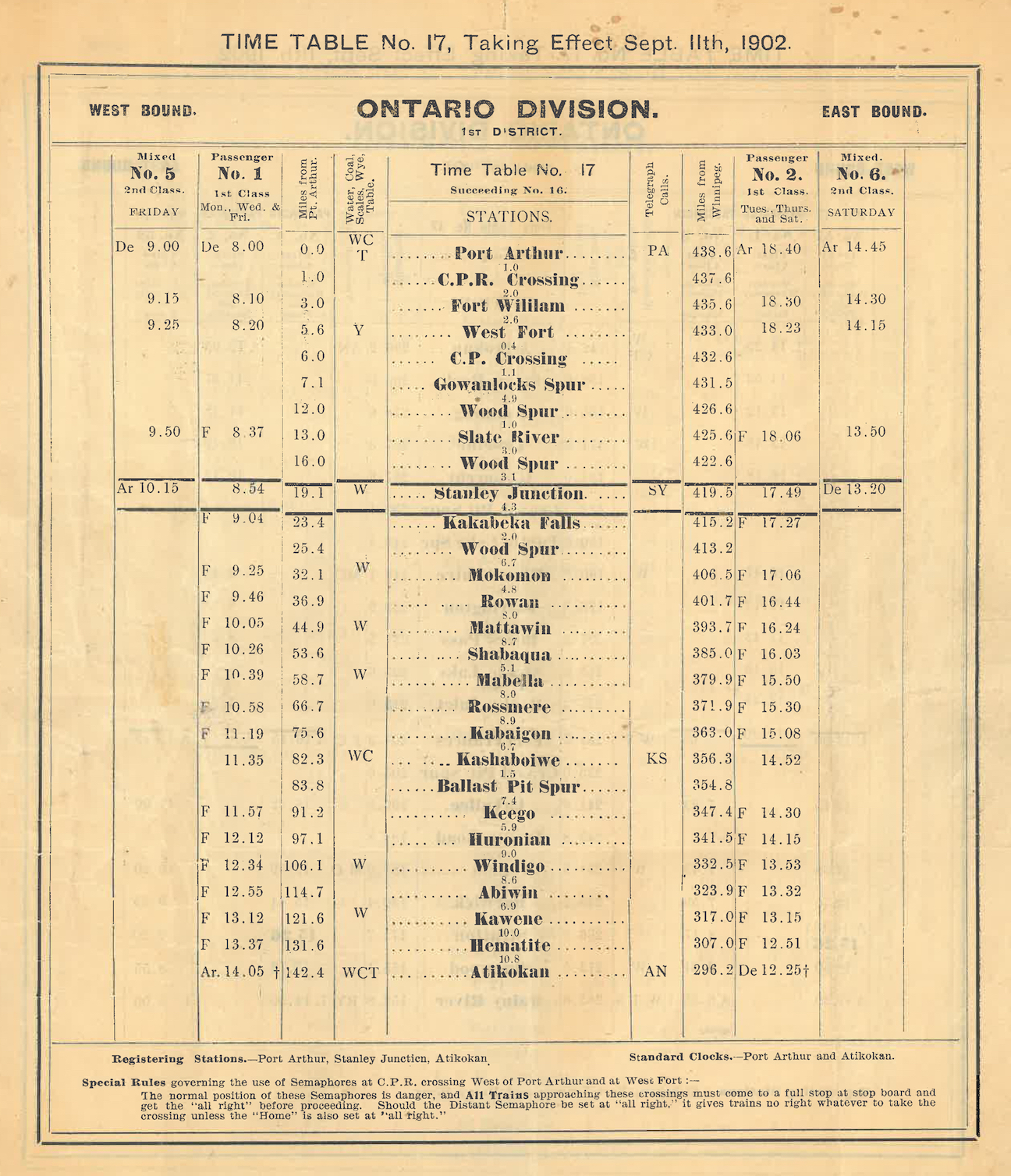 CNoR Port Arthur Subdivision Timetable, September 1902.