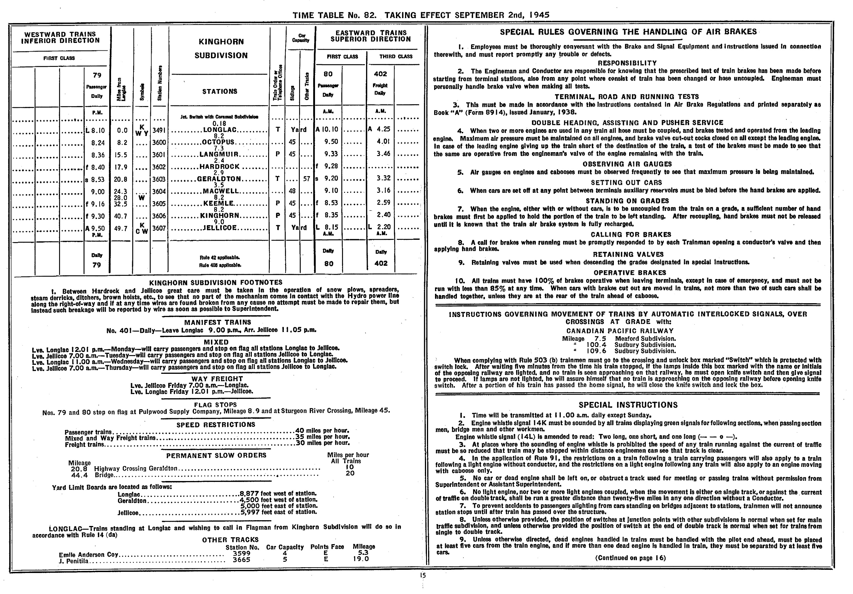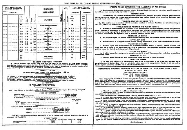 CNR Kinghorn Subdivision Timetable, 1945.