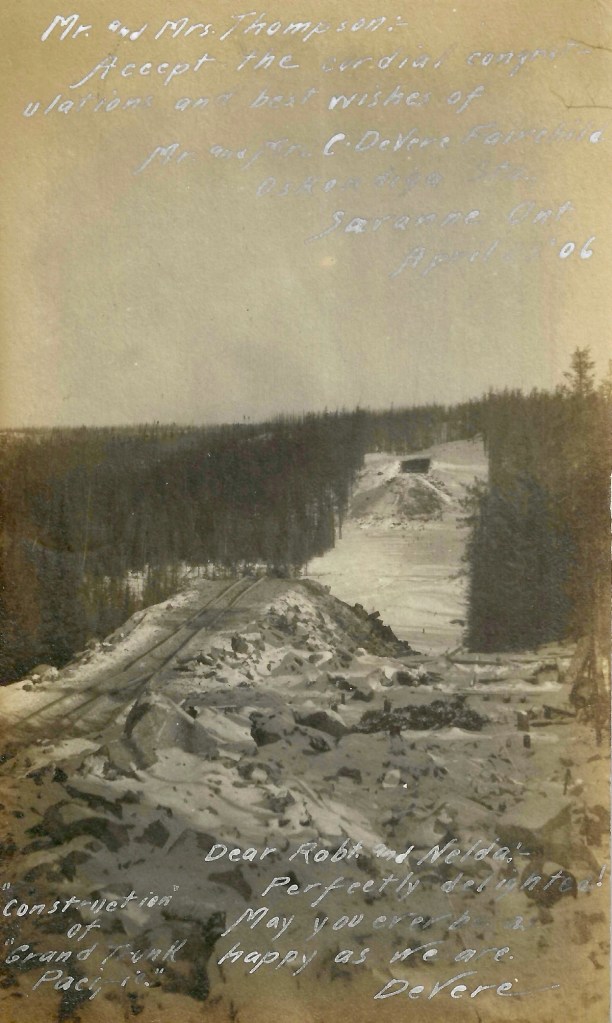 Then and now photos highlighting an unknown location on the former Grand Trunk Pacific Lake Superior Division/CN Graham Subdivision. This postcard, dated April 1906, states “Construction of Grand Trunk Pacific.” It also bears a message to Mr. and Mrs. Thompson of Tacoma, Washington (address indicated on the back) from Mr. and Mrs. C. Devere Fairchild of “Oskondaga Stn, Savanne, Ont.”