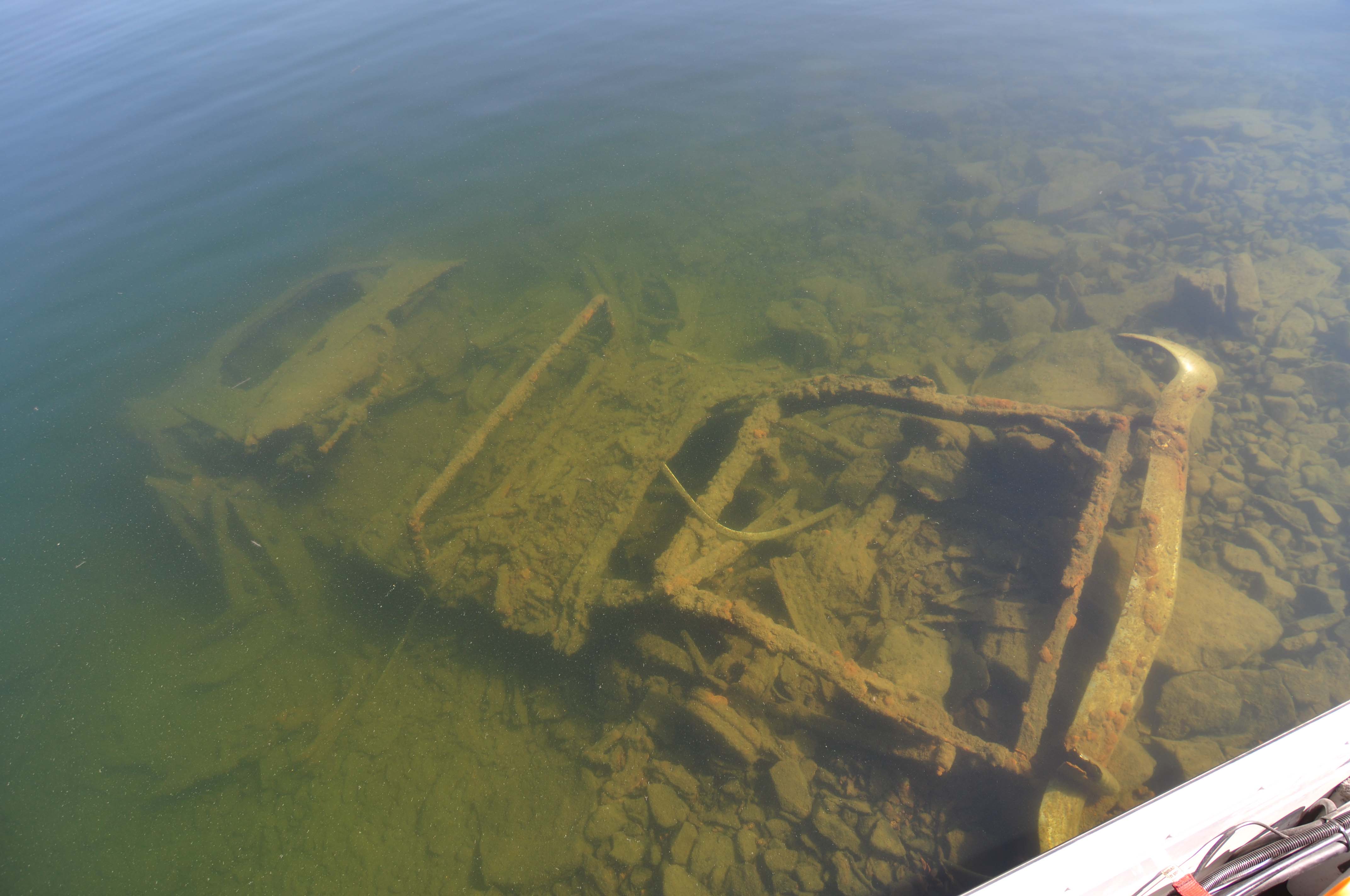Back in the boat we went another 1000m back toward the east end of the lake. It was at this spot that I had found the intact insulator. My goal was to grab some of the wire (to preserve the authenticity of it) and maybe find more poles and insulators.