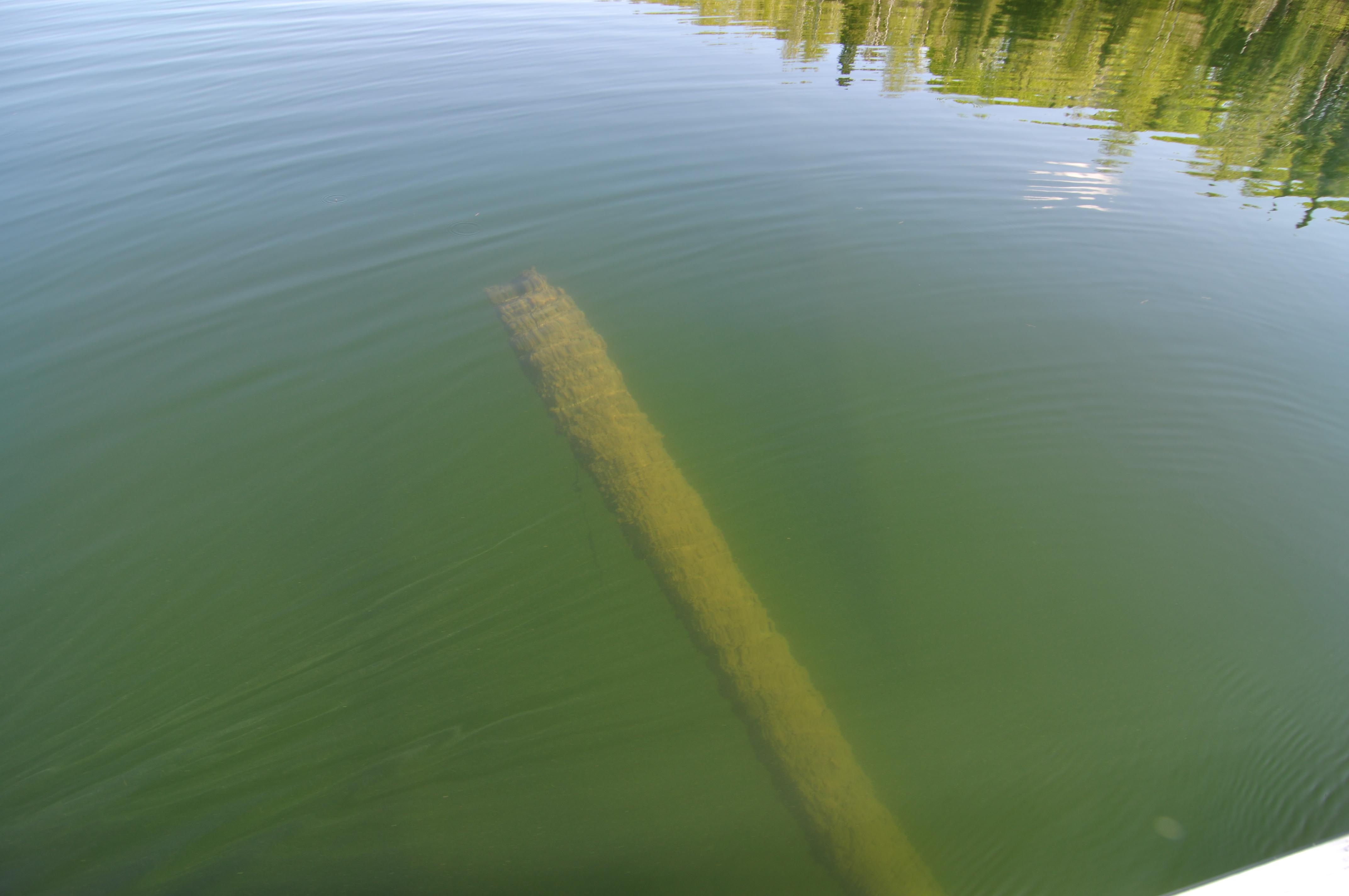 Heading from the east side to the west is very neat, but also very freaky. There are still pilings that jut upward from the bottom, massive 12+ inch logs still in their place 121 years after being driven through the mud to the bed rock. It’s kinda fascinating to see. Last year I was sent an image that was taken from the air in 2007 when the lake level was very low (the rock bed that today is 3 feet under water was above the surface). It almost appears as if the trestle is still there, hiding below the water.