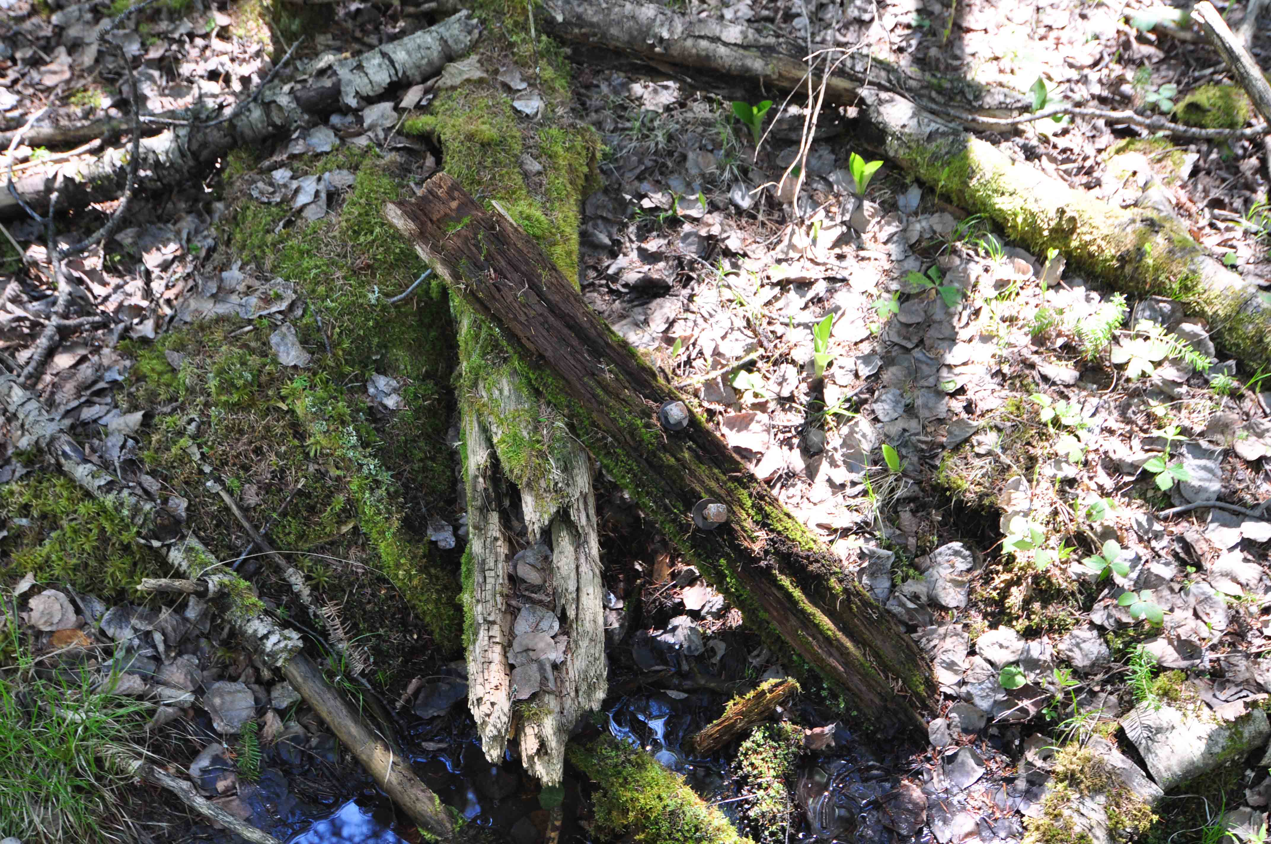 After poking around for a while, we made our way back east about 600m. Just off a small bay on Little North was a spot where I had previously found a telegraph pole and the map also indicated that there were at one time some buildings. I had found a very well preserved telegraph pole (they were put up in 1903) in this spot back in 1997. At that time, the crossbeam was still attached to the pole. When I saw it again in 2011, time had taken its toll and the crossbeam had fallen off. I don’t normally grab too much stuff when I hike the railway, but I decided that this object would soon fall apart and it might be worthwhile to save it and get it into a museum or something. God, I feel like Indiana Jones…”it belongs in a museum!”