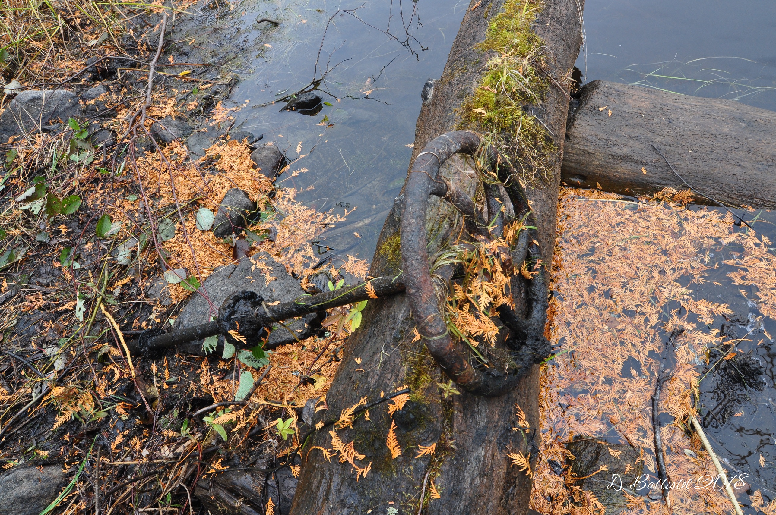 From there we travelled 3km northeast to where the G&LS crossed a small creek just south of the international boundary. I had been there on several occasions before, but just like the corduroy trestle, I wanted to get some footage with the wireless microphone. On the approaches to the creek, we realized just how low the lake levels were. Parts of the shore I never seen before were exposed and water depth dropped to less than a foot. It was not easy to maneuver the boat around in that environment, but I managed. In the process, I made a neat discovery. Back in 2011, I was sent the image of a rail car brake wheel taken at the crossing by some of the guys from the US Forest Service. With the low water levels, I found the wheel as well, shocked that there was quite a length of shaft attached to it.