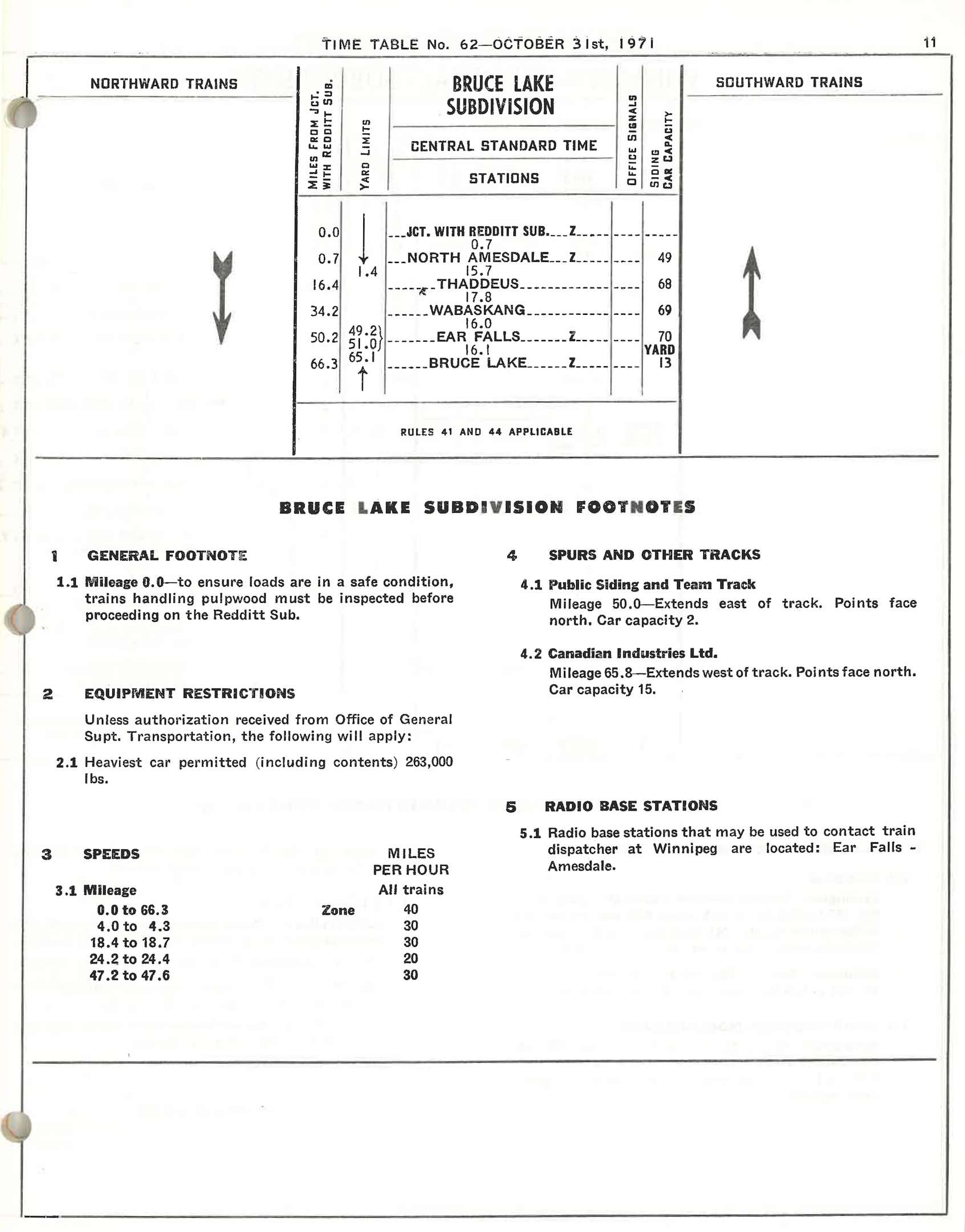 CN Bruce Lake Subdivision Timetable, October 1971.