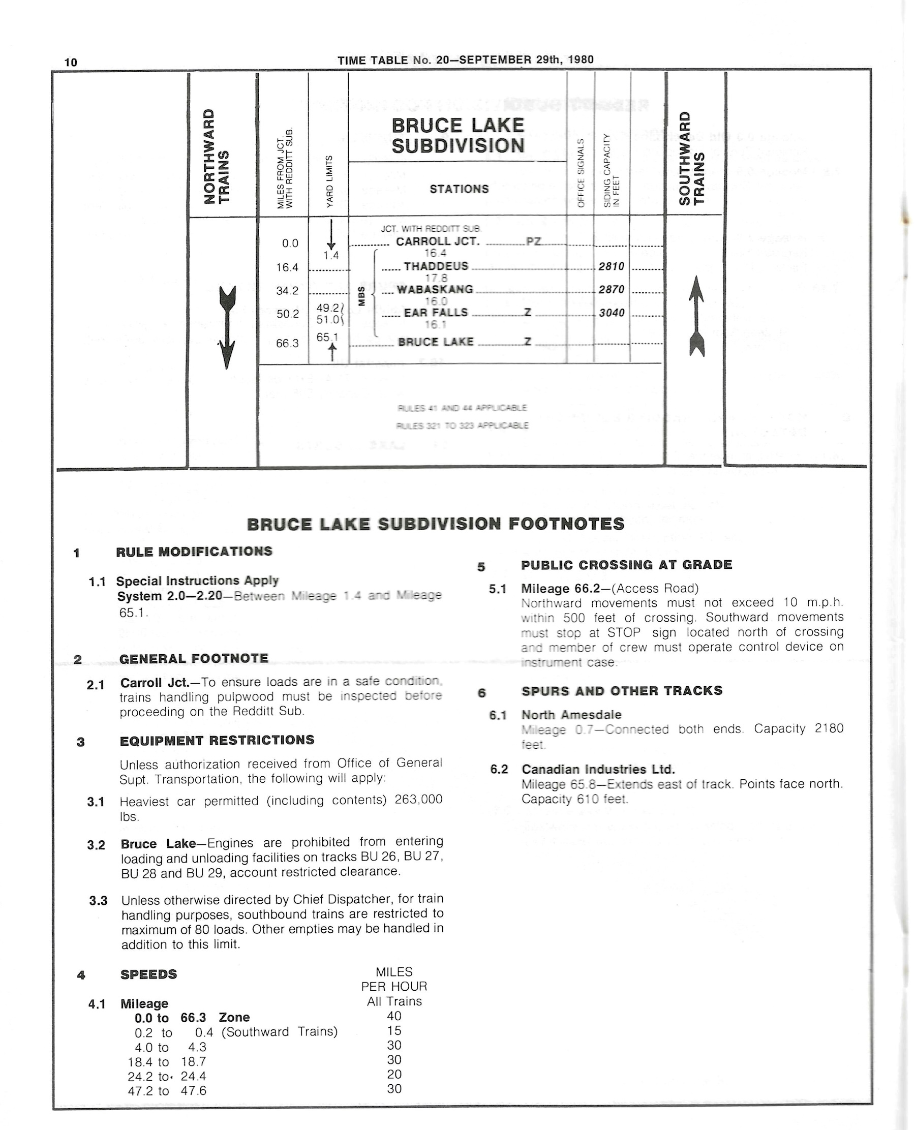 CN Bruce Lake Subdivision Timetable, September 1980.