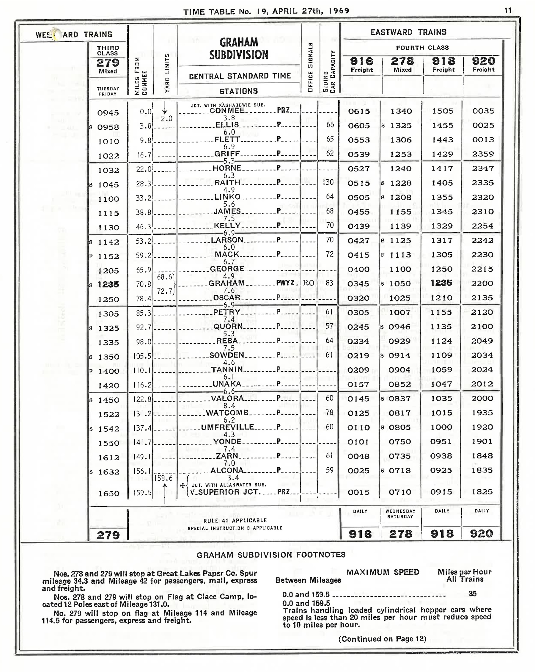 CN Graham Subdivision Timetable, April 1969.