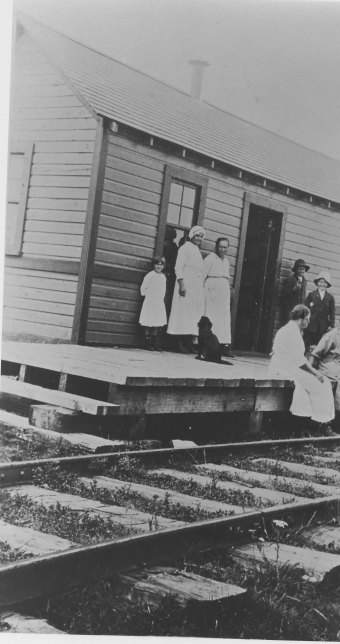 Women & children standing on railway platform Oscar, ON, undated. (Archives & Digital Collections at Lakehead University Library)