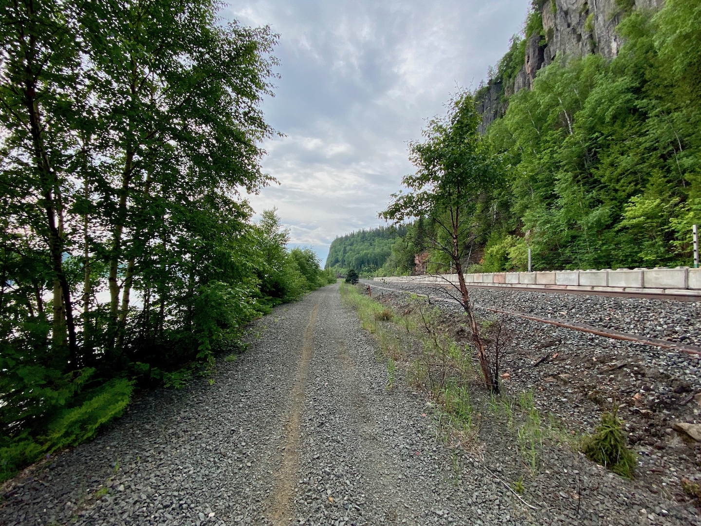 The next two photos show the same area in June 2021, taken from the grade of the now decommissioned Kinghorn Subdivision. The Canadian Northern Railway, who originally built the line between 1911 and 1914, had no other option than to run their grade, at an extraordinary expense, outboard of the Canadian Pacific line. Construction entailed the dumping of tons of fill to create the right of way and extensive use of rip rap to keep the eroding water at bay.