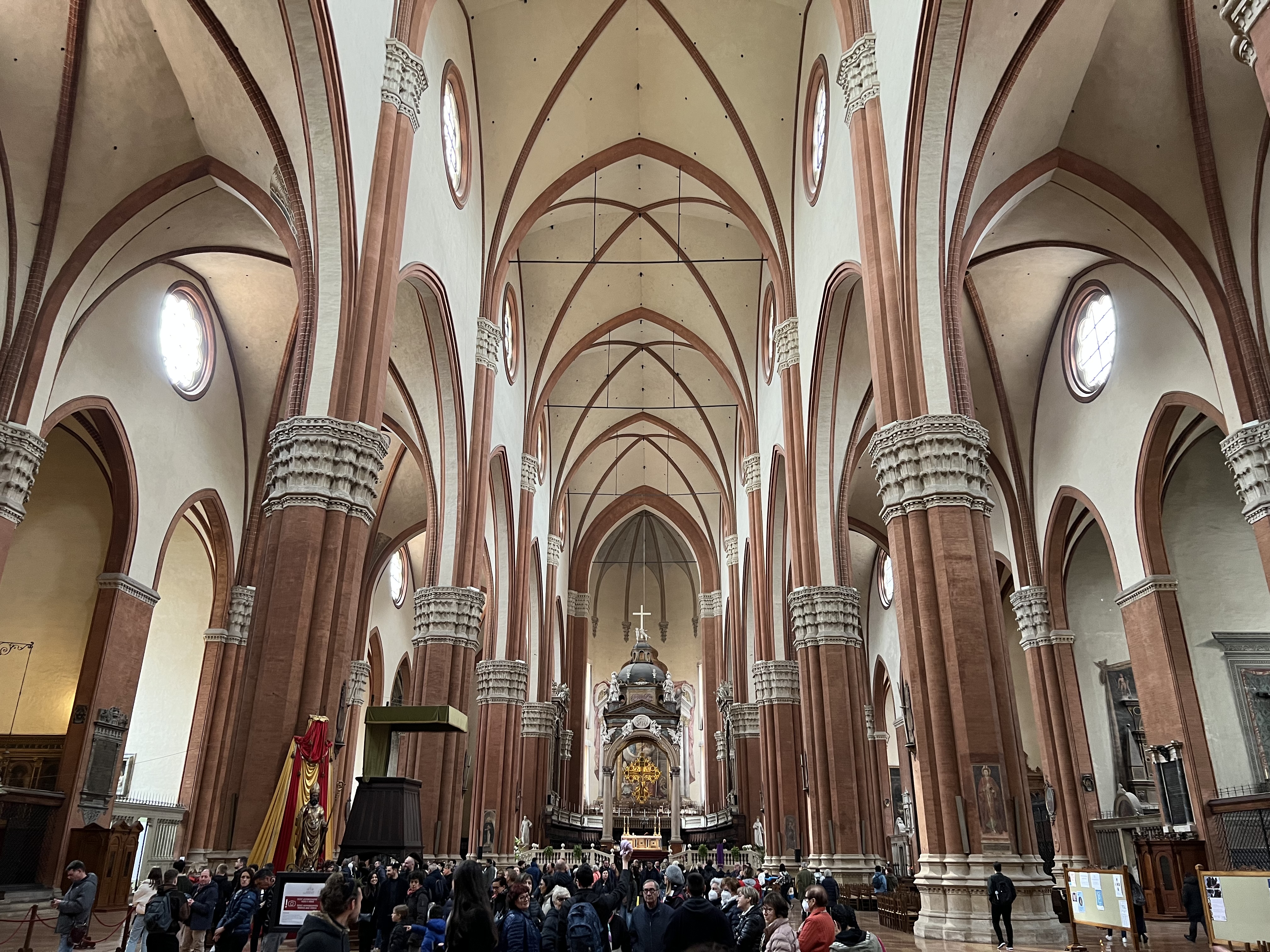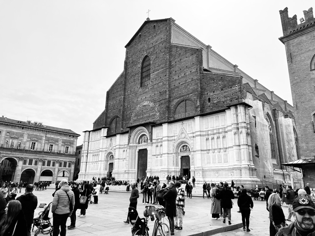 It’s been a long and busy day, so I’m just getting around to finishing this as I settle into my room before bed. Although our visit to Bologna was very brief, it was a very pretty and impressive city. We walked from the bus station to the Piazza Maggiore through what are known as the Arcades, which are covered walkways beside the streets. From there we had time to explore parts of the city centre. Our chaperone group first paid a visit to the Basilica di San Petronio, a large and beautiful gothic church.