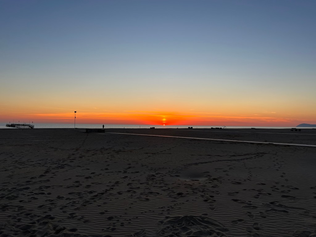 Ciao, sono tornato ragazzi! Oggi è un’altra mattinata soleggiata ma molto fredda (today is another sunny but very chilly morning). Even though we have a later start today, I still woke up early to run down to the beach to snap a photo of the sunrise. In the process, I locked myself out of the hotel and froze my butt off…double whammy! It was worth it though, and thank Jesus the door was open when I got back! While it was a crispy 4C at the crack of dawn, it’s supposed to be 15 by this afternoon, which hopefully will be enough to keep us sufficiently toasty for our wanderings.