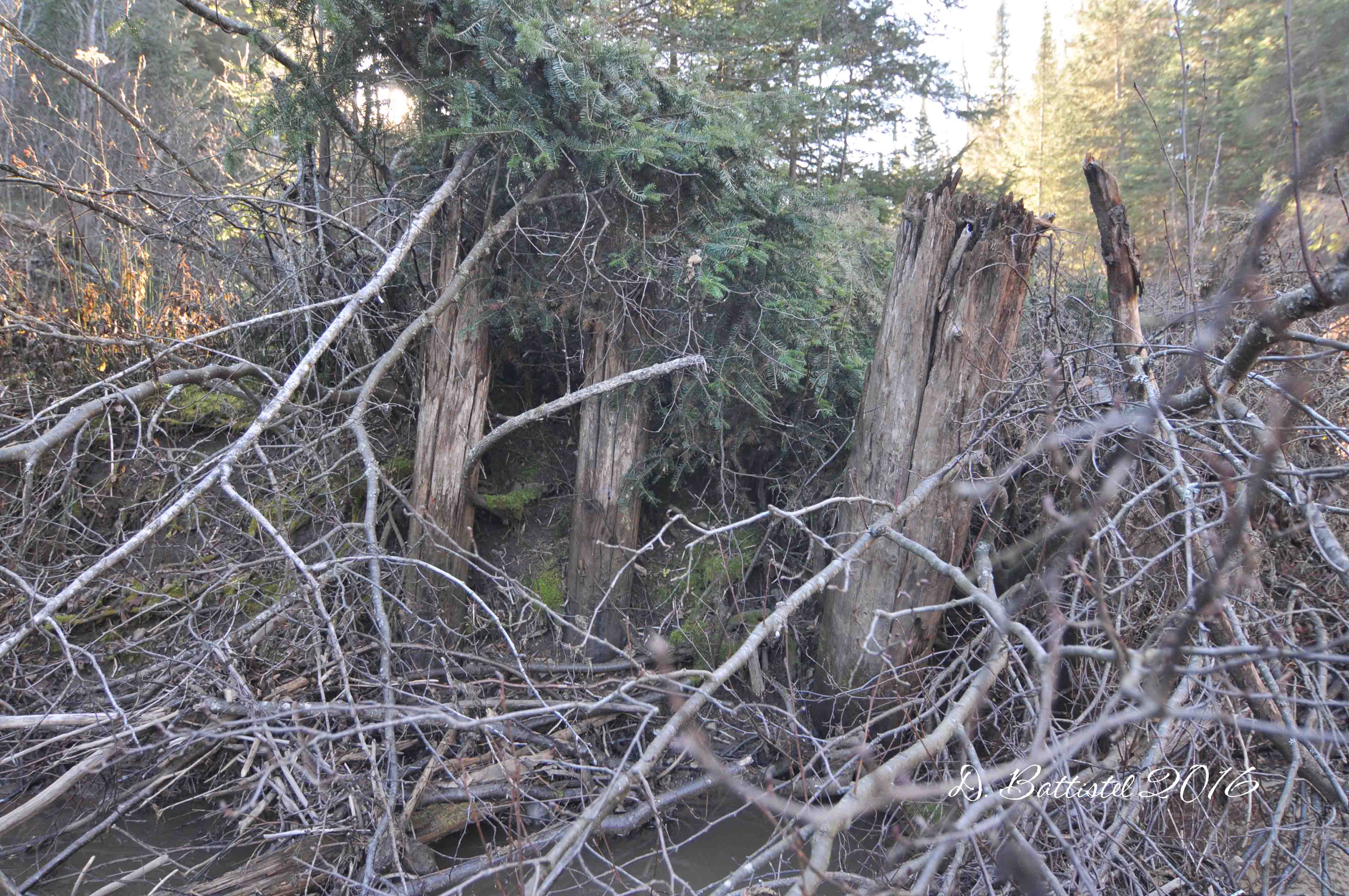 The benefits of visiting this area in the fall was quite evident at bridge five. I can remember a lot of the remains of the piles being obscured by brush and trees. This was not the case this time, with the all of the piles as well as some metal objects being totally visible in the creek. It is interesting to note that a few of the piles, but not all, have been cut off close to the waterline. I wonder why it was done and when?