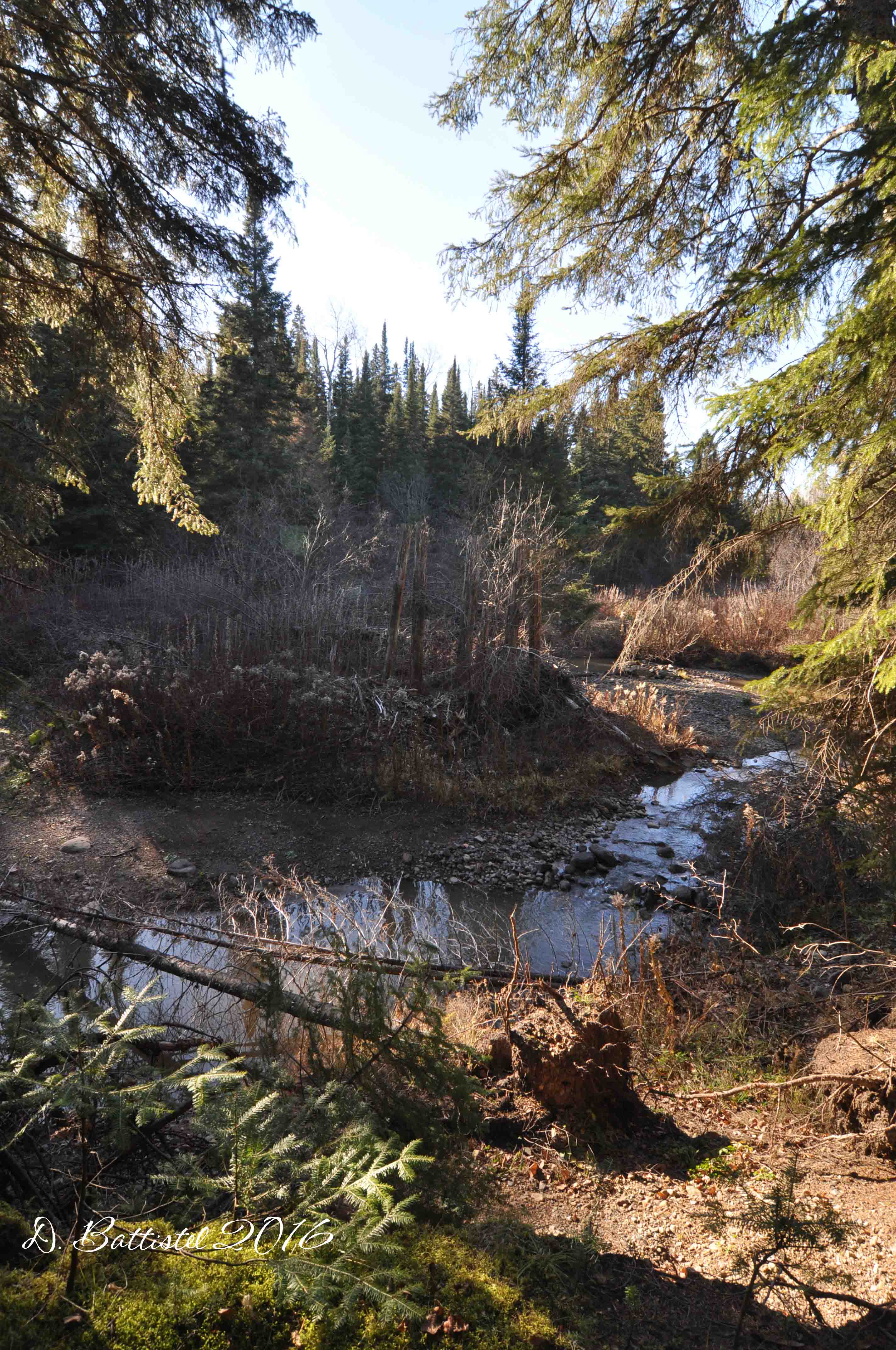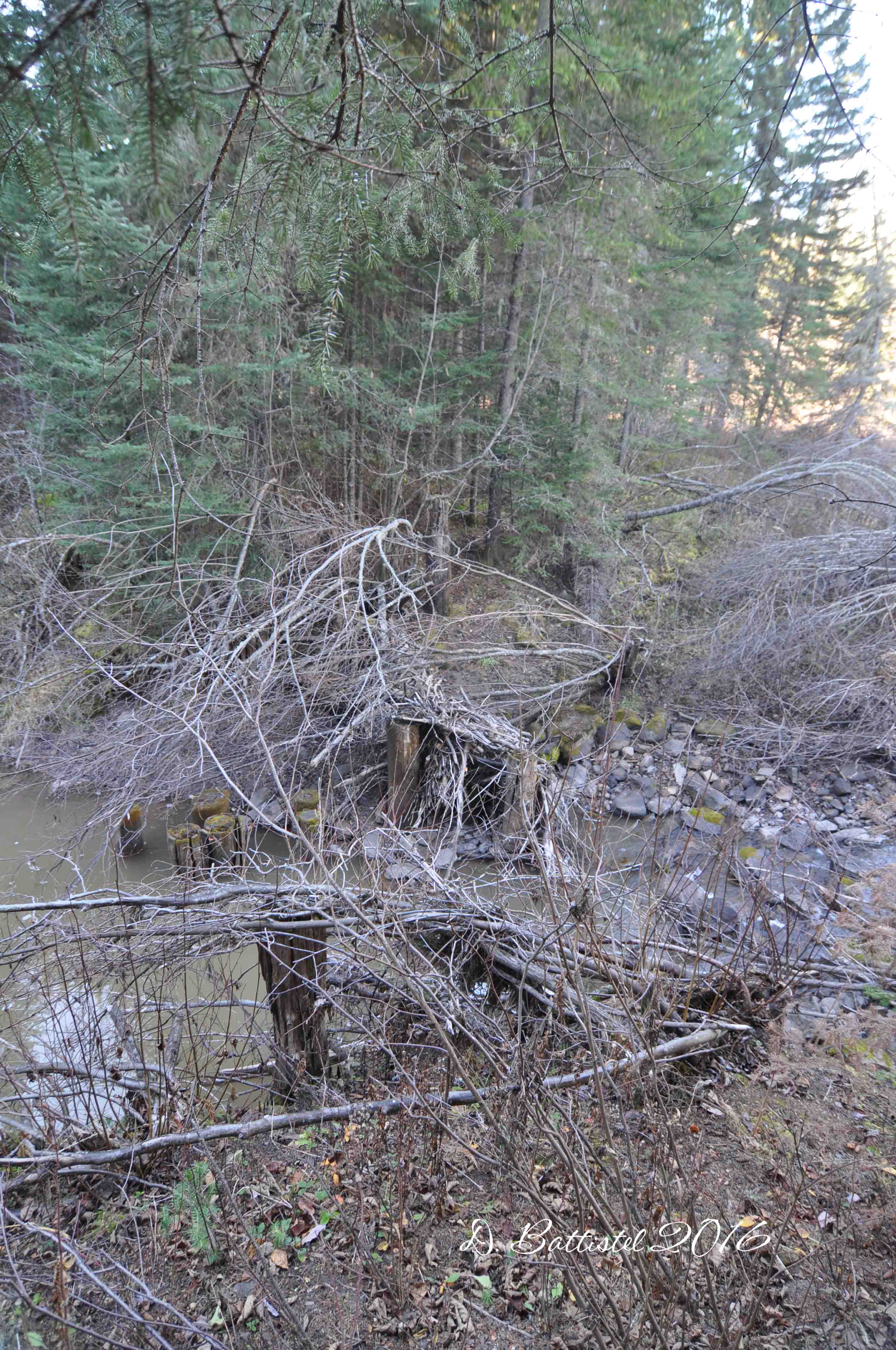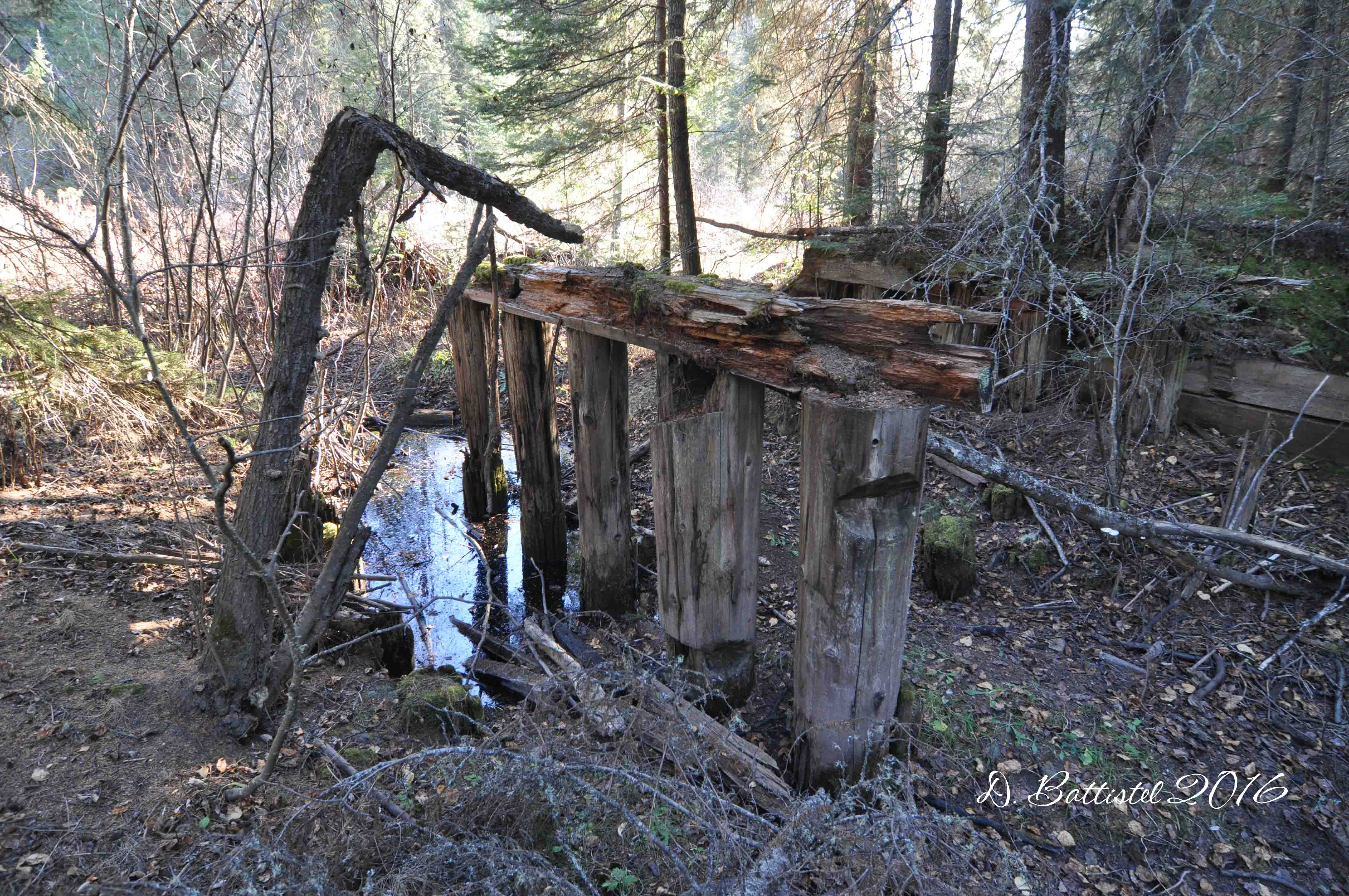 Well since I mentioned it, I guess I should talk a little about my recent hike along the railway. My railway work has been on the back burner lately, so I was really itching the do something. The weather was fantastic, and the fall had been fairly dry, so I thought why not give it a shot. I have a few areas that I’ve wanted to re-hike in the fall, when the leaves are down and it is much easier to see things. I picked the area around Hillside, which is located between Nolalu and Silver Mountain. Here the railway winds its way along the Beaver (Dam) Creek, crossing it 12 times. Because it’s not easy to get to, there are many remains of the bridges to be found.