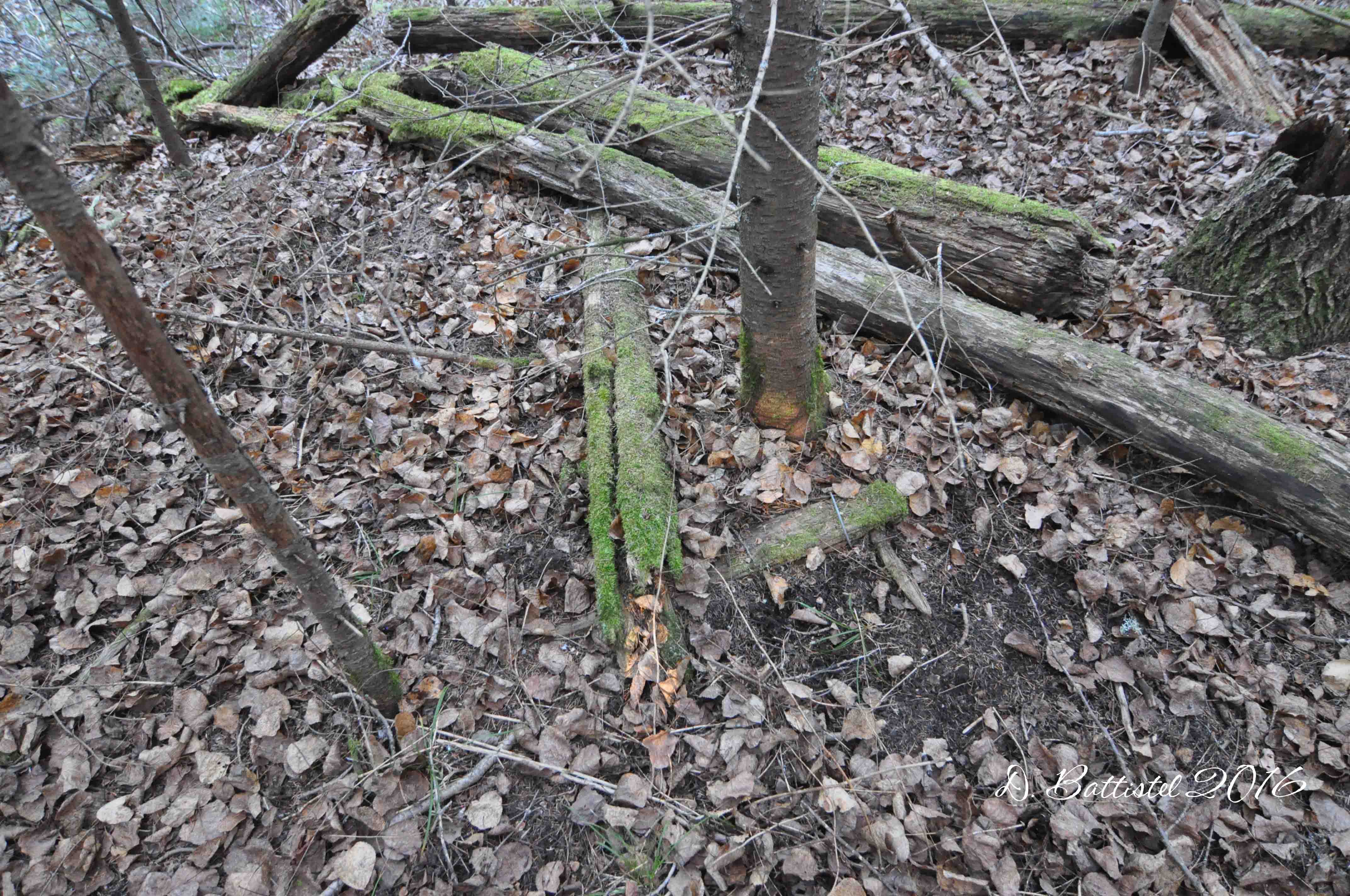 The railway stop at Hillside (milepost 36) was located west of Nolalu, where the railway left the Whitefish River and then travelled along the Beaver or Beaver Dam Creek towards Silver Mountain. In my previous hikes, I had not been able to locate the grade between Highway 588 and the first bridge. With all the leaves down, I picked it up very quickly. South of the road it passes through a nice, but very grown in cutting which lasts almost right to the first crossing.