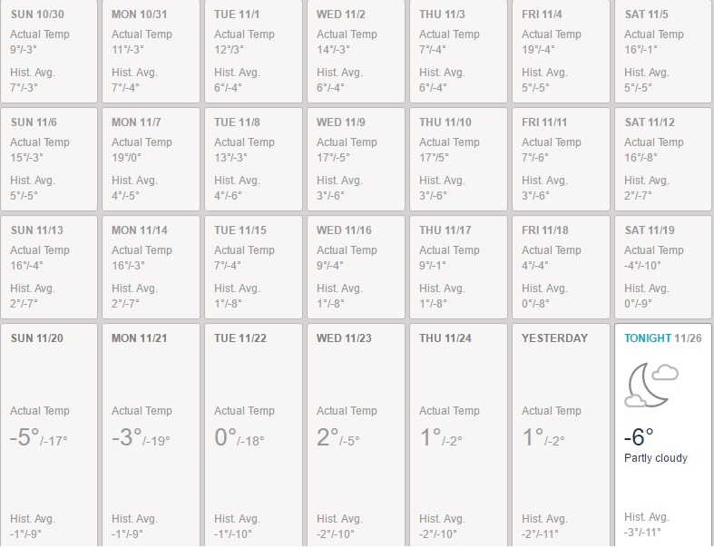 Now speaking of Christmas, I think this year we’ll have a white one for sure. Last year it was in serious doubt, only saved by a few dumps within days of the big event. Our weather has once again been very bizarre. The first half of November was gorgeous, with temperatures many times in the double digits. It was so good, I decided to go on a hike along the railway in the middle of the month. The temperature reached 16C and I was soaked in sweat by the time I was done. Just ridiculous for November! However, it was not to last. That hike was on Sunday and by Friday we were on the receiving end of a winter storm. The temperature dropped in the next few days and it was -17C with the wind. Oh Mother Nature, you are a cruel mistress!