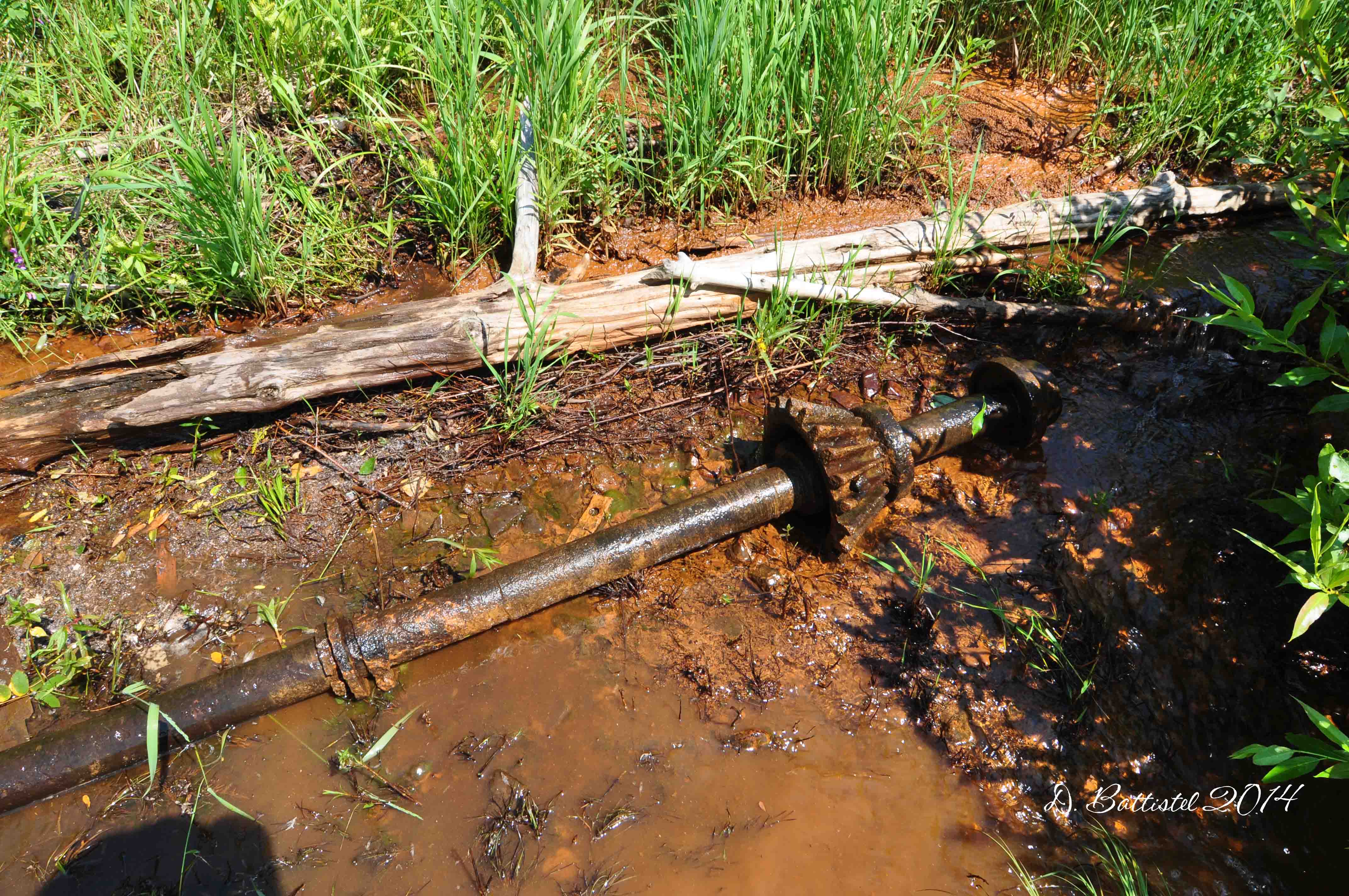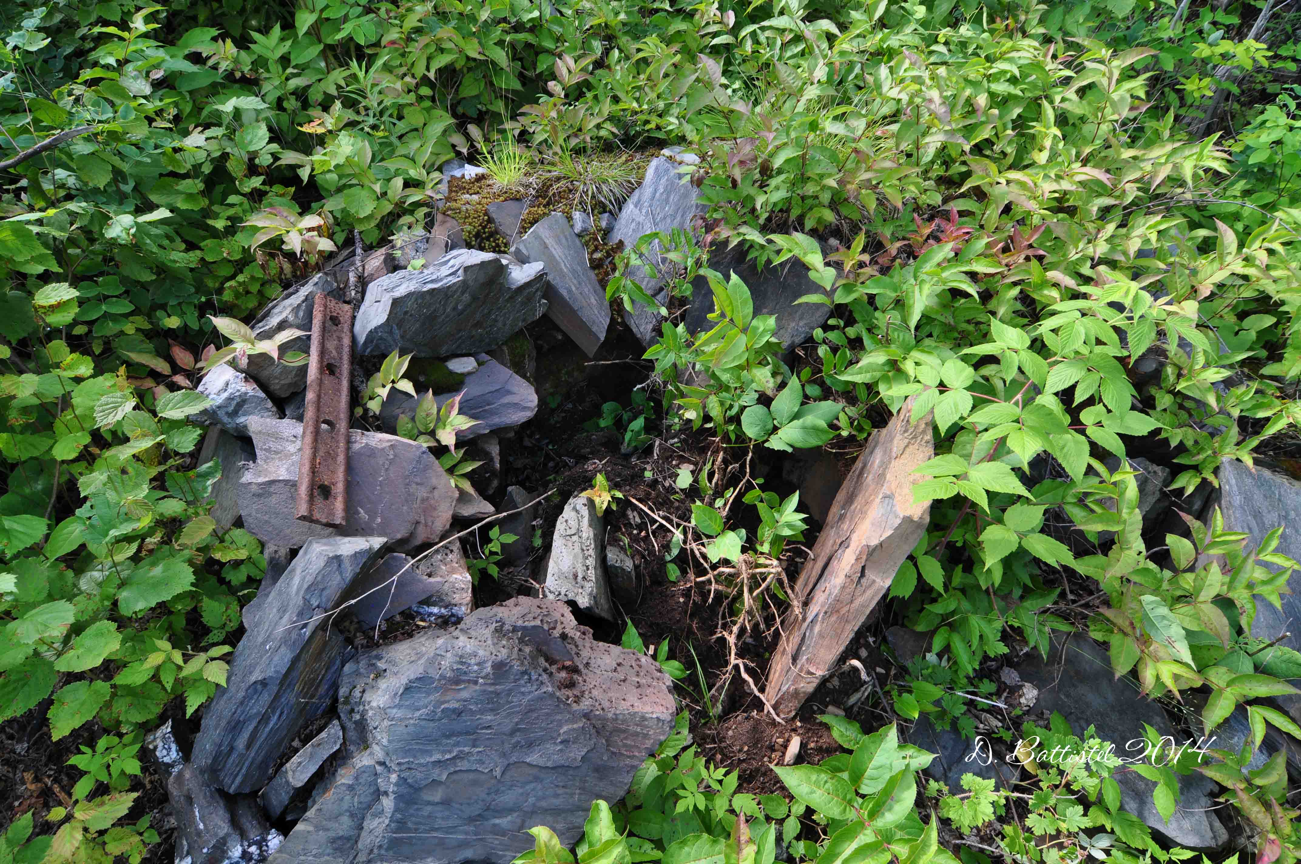 From Gunflint City it was back over the ridge toward the Paulson Mine. Finding the shaft, I was a bit disappointed at the state it was in. Surrounded by a green snow fence, the opening was completely blocked by several trees that had fallen across the collar of the shaft, shielding my view of the inside. I was able to explore the site a bit, finding some pieces of machinery and seeing the piles of oxidizing tailings excavated from the shaft.