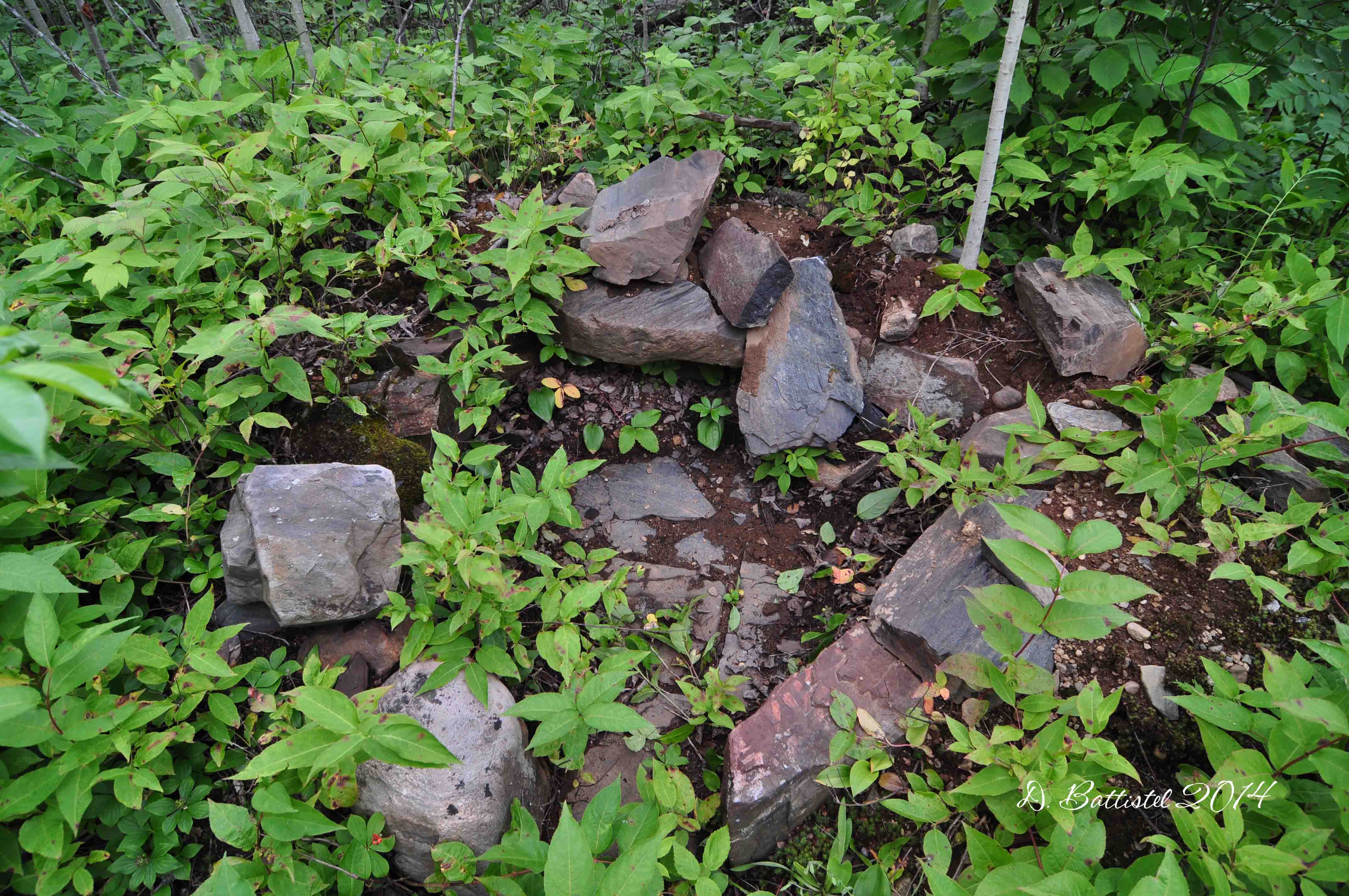 After drying out back at the resort (the sun came out later in the day), I was back in the same area the next morning. It was bright, sunny and warm and my plan was to explore some of the sites along the Kekekabic Trail, Gunflint City and hopefully locate the Paulson Mine. I made a quick stop at one of the test pits located alongside the trail (mislabelled as the Paulson Mine; now it is the third of five test pits in the area) and then headed toward Gunflint City. It would be a bit of a hike over the ridge between the trail and the mining camp, but I eventually made it. There I found some remains of the buildings that were at the site and it was interesting trying to envision what it would have looked like back in the 1890’s.