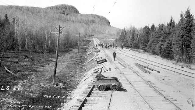 November 1911 saw the commencement of construction of Canadian Northern Railway’s (CNoR) long anticipated eastern link between the Sudbury area and Port Arthur (now Thunder Bay). Geographical issues locating a route meant that CNoR surveyors and engineers had no choice but to run an important section of grade on Nipigon Bay outboard of the pre-existing Canadian Pacific line. This required several miles of infilling right beside an active rail line, which created some very dangerous work conditions. When CPR trains passed, the workers had to scatter for any safe location to avoid being struck by the oncoming locomotives.