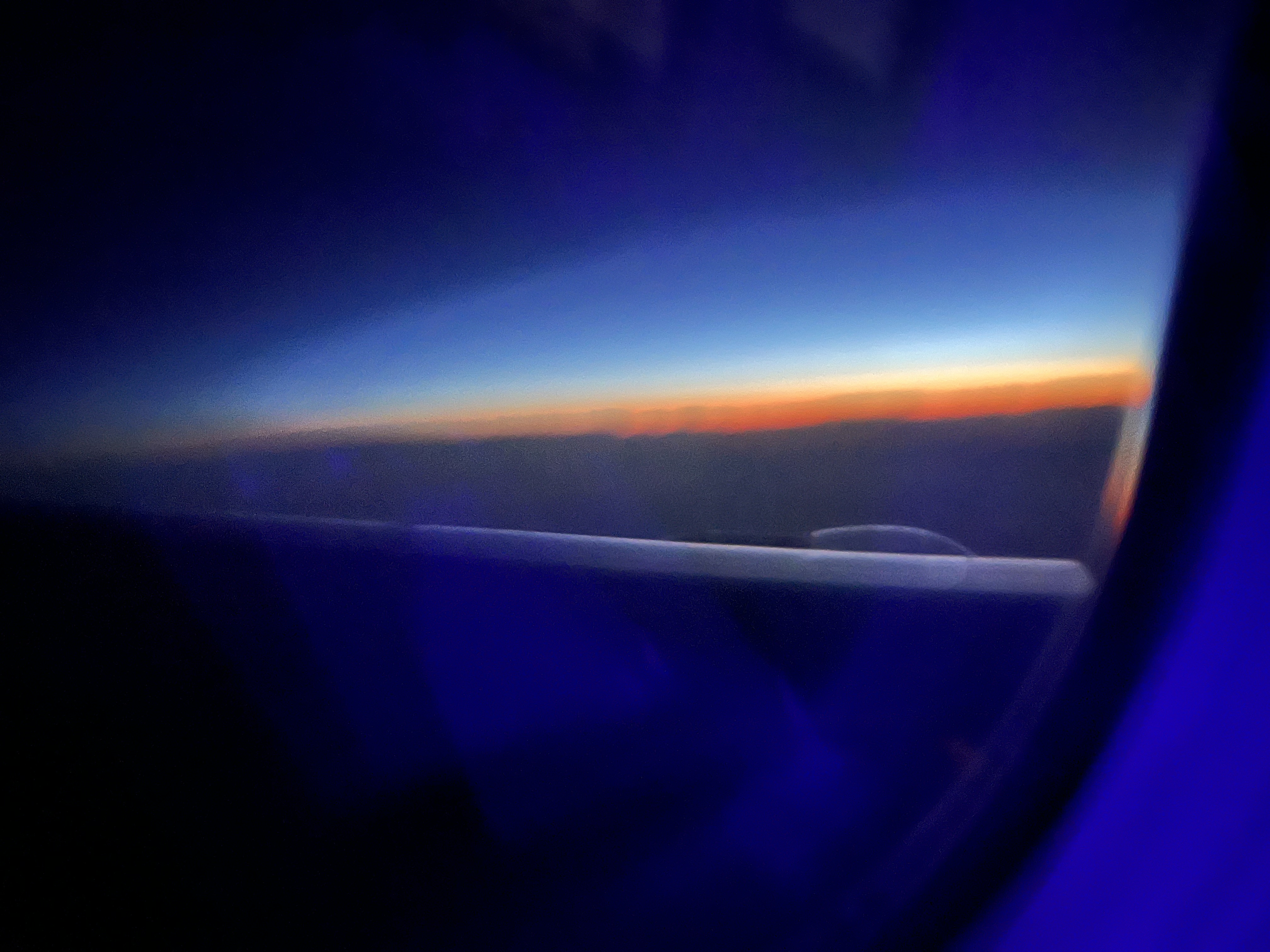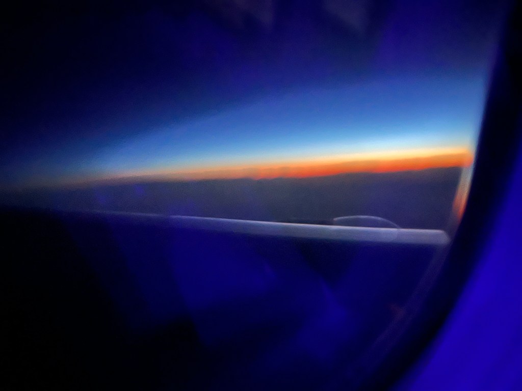 Well that was interesting. I was absolutely starving when we finally got our food, as it is now 10:10 local time and I last ate at 1:30. So we had the option of chicken or pasta, so took the chicken. Besides the entree, we were given a small container of potato salad, bread, butter, cheese and a brownie. It wasn’t terrible, but certainly not filling. The chicken was some sort of pot pie? that included potato, corn and peas; it looked awful and was heated to the same temperature as the surface of the sun. Thankfully my seat buddy, Kim, gave me her bread and butter, and scammed me another cheese. And then I ate an energy bar too! So I feel better now, and hopefully can get some shut eye. See you in the morning.