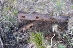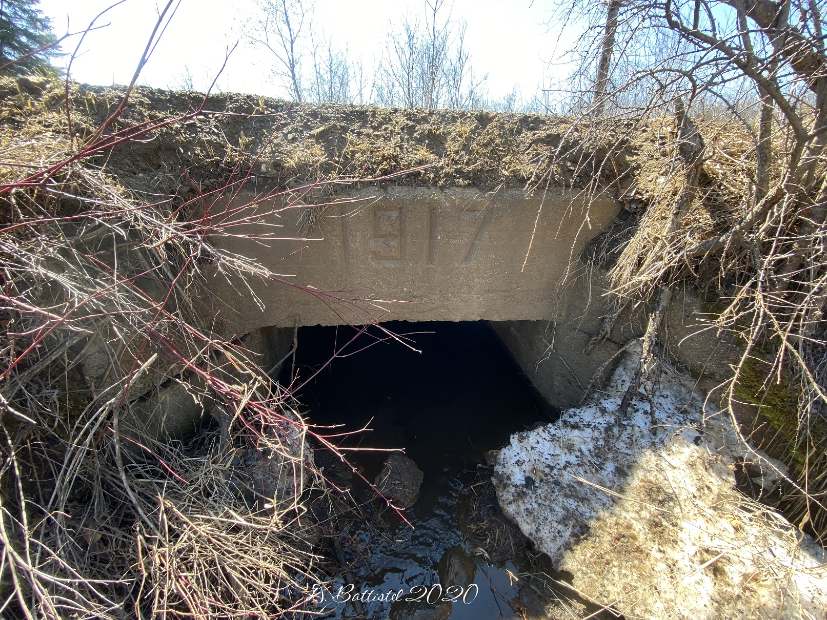 The hike went smoothly, though it did take longer than I expected. I found what I believed to be the location of Ellis Station, complete with the remains of the water tower. The only real shock I got was when I located another concrete culvert. I never really thought I’d find one so far west, my thinking that they were only built closer to Thunder Bay. This one was within a few hundred metres of the turnaround point at the Sunshine Crossroads, atop a very high embankment. I don’t think I’ve ever seen an embankment that high, as it was some 55 to 60 feet above the creek. I saw the creek and immediately my hopes went up and I quickly charged down the slope to investigate. From a distance I could make out the form of the concrete opening and instantly became giddy. The south side was okay, though I could not approach it closely as the water was very deep. The north side was a complete disaster; successive floods had pushed piles of debris in front of the opening and had exposed some twenty feet of the culvert by eroding the grade above it. It is beginning to come apart and crumble, but I guess it has been maintained in 26 years and was built in 1917. It’s to be expected.