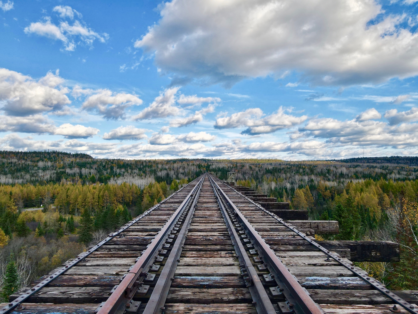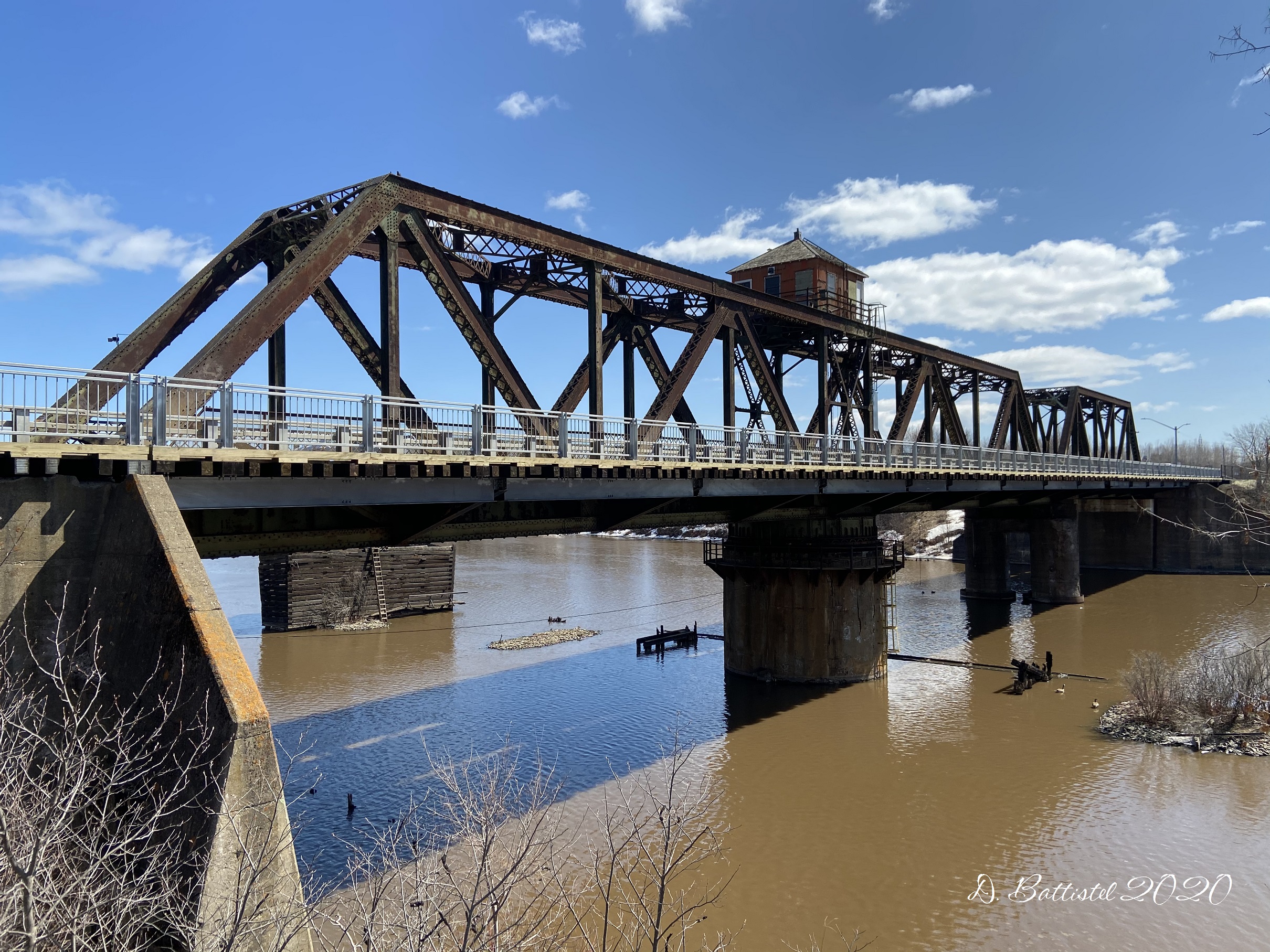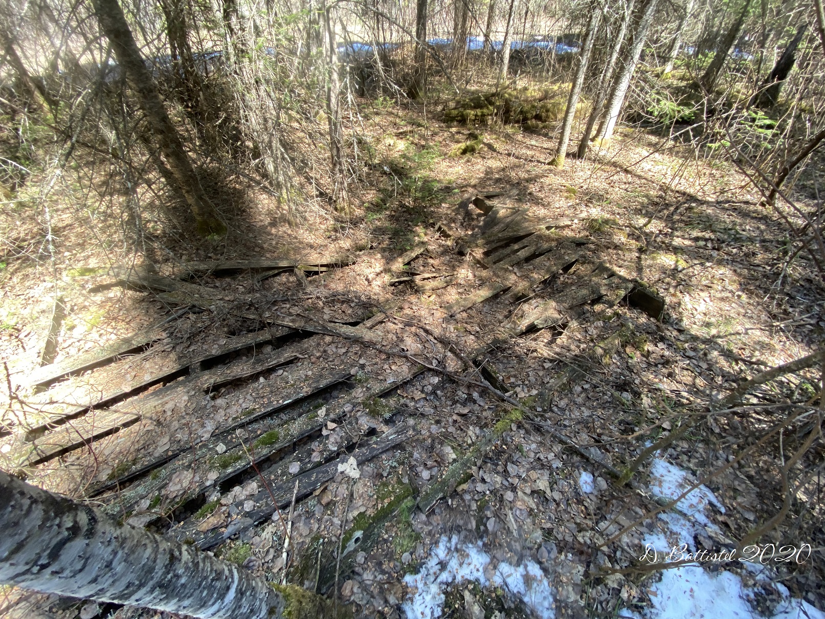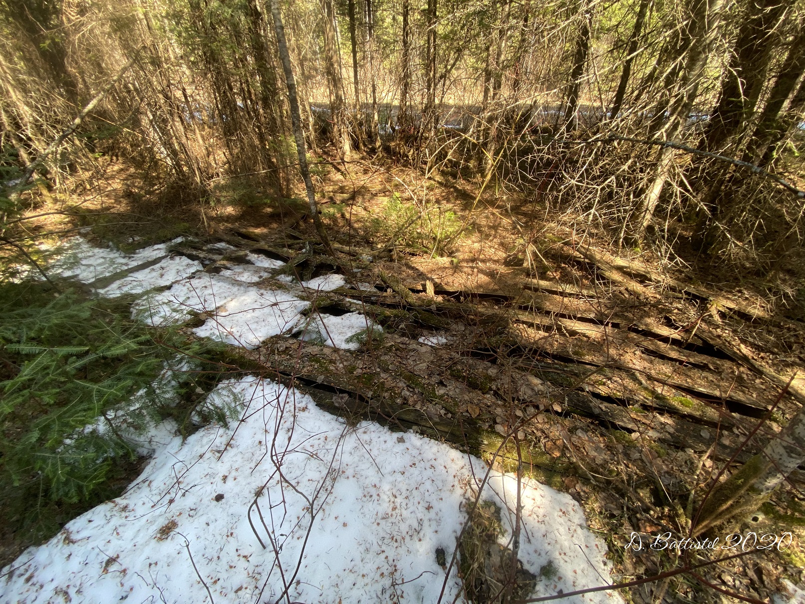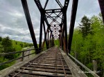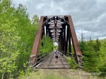 I had been over the Matawin River bridge once before, shortly after the line was abandoned, around 1996. Fast forward 24 years and I found myself crossing the river again on that bridge. Let me preface this with the fact that I’m not good with heights, and walking across railway bridges isn’t easy as there’s not a solid deck, but rather large timbers spaced about 10 inches apart; it makes for an awkward walk. Plus, this bridge has been abandoned for 26 years, so the walkways on the sides are all rotten, so you need to walk down the middle of the bridge.