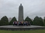 Alright, so I’m sitting here in the lobby of the Cloth Hall, the Flanders Fields Museum, waiting for everyone to finish their visit. Our first stop upon reaching the Ypres area was the St. Julien Memorial (Sint-Juliaan). The memorial, a statue, is known as the Brooding Soldier and marks the first Canadian action in WWI at the Second Battle of Ypres. Here, near St. Julien, the Canadians fought a desperate 3-day battle against the Germans to hold back a massive attack which included the first use of poison gas in war. It was rainy and very windy, but we managed a quick prayer and a group photo.
